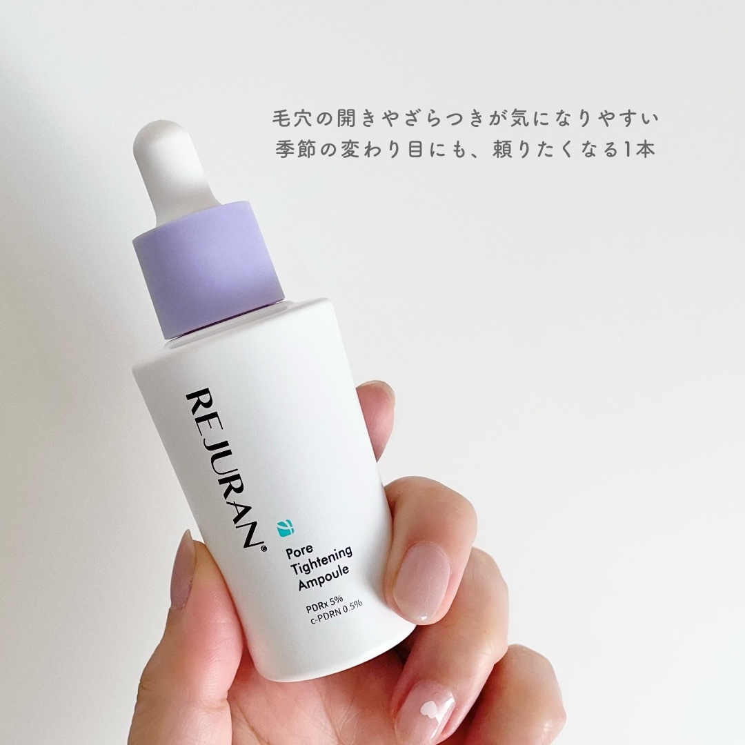 - エステ専門ブランドREJURANから、敏感肌を考えた ポアタイトニングアンプルが登場。 特許技術DOTにより生まれた独自成分 c-PDRN※1を配合し、乾燥しやすい肌にみずみずしいうるおいを届け、キメを整えながら、なめらかな肌印象へ導きます。ジェルタイプの軽やかなテクスチャーでべたつきにくく、朝のメイク前にも心地よく使用いただけます。 乾燥による毛穴の目立ちが気になる方に寄り添う低刺激設計で、皮脂によるテカリが気になる肌にもすっきりとした使い心地をサポート。ハマメリスエキス※2や西洋ノコギリソウエキス※2、そして弾力感をサポートする マンノース※1・硫酸銅※2・リシン※1・プロリン※1を組み合わせ、リジュラン独自の c-PDRN※ とともに、角層ケアをWで支えるアンプルです。 ※1 保湿成分 ※2 整肌成分