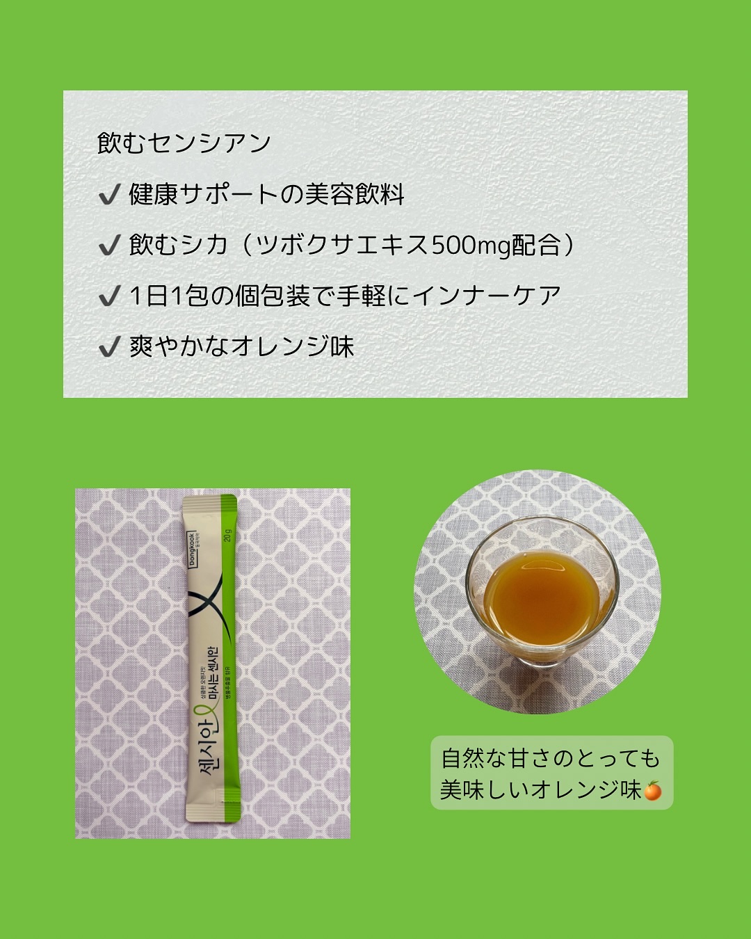 日々のライフスタイルに“飲む新習慣”を韓国の製薬会社ブランドから登場した【飲むセンシアン】は、1日1包で続けやすい健康サポートの美容飲料✨ツボクサエキス*配合で、塗らずに飲むインナーケア🍊さわやかなオレンジ味で抵抗なく取り入れられるのもポイン...