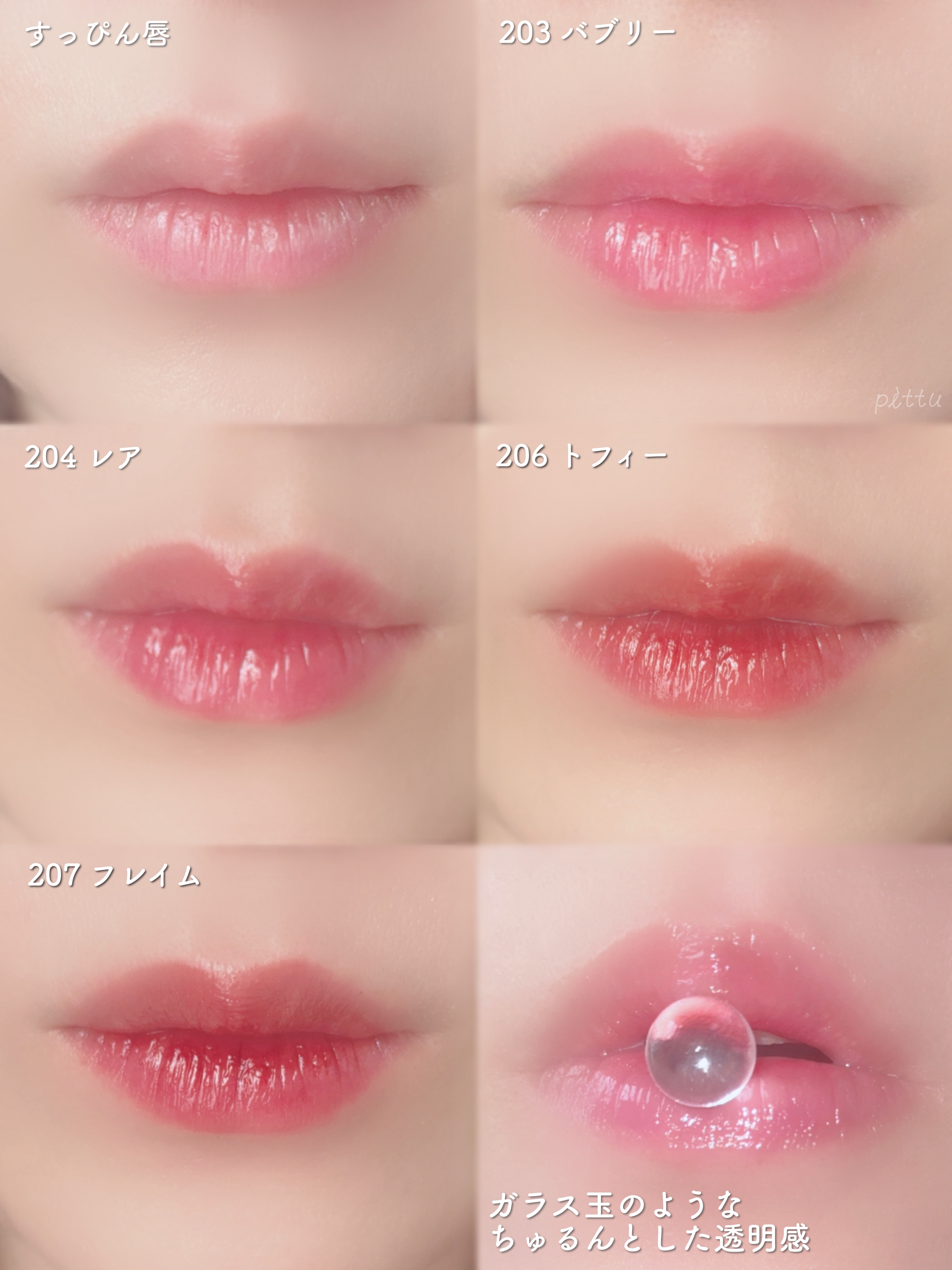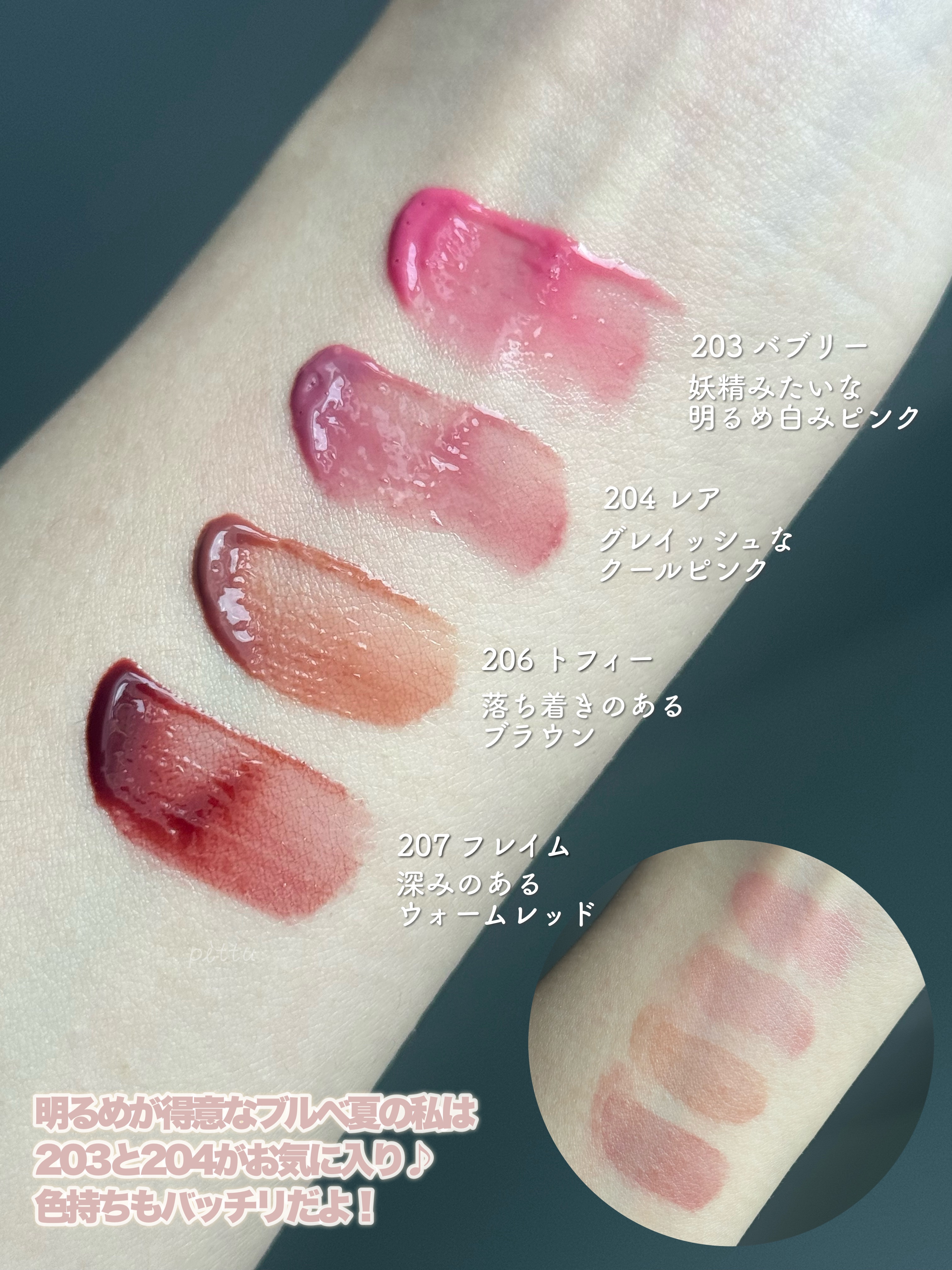 - <201 フェアリー> ダイマージリノール酸ジイソステアリル、ジフェニルシロキシフェニルトリメチコン、ビスジグリセリルポリアシルアジペート-2、水、ジフェニルジメチコン、水添ポリイソブテン、セチルPEG/PPG-10/1ジメチコン、ポリソルベート60、ペンチレングリコール、グリセリン、イソステアリン酸ポリグリセリル-4、フェノキシエタノール、1,2-ヘキサンジオール、セテアレス-20、酸化チタン (CI 77891)、(アクリル酸ヒドロキシエチル/アクリロイルジメチルタウリンNa)コポリマー、ステビオシド、スクワラン、香料、ジラウラミドグルタミドリシンNa、エチルヘキシルグリセリン、エチレンジアミンジコハク酸3Na、赤色227号 (CI 17200)、水酸化Al、黄色5号 (CI 15985)、ポリアクリル酸アンモニウム、イソステアリン酸ソルビタン、黄色4号 (CI 19140)、BG、赤色223号 (CI 45410)、青色1号 (CI 42090)、アラントイン、パンテノール、ツボクサエキス、ヒアルロン酸、加水分解ヒアルロン酸、ヒアルロン酸Na <203 バブリー> ダイマージリノール酸ジイソステアリル、ジフェニルシロキシフェニルトリメチコン、ビスジグリセリルポリアシルアジペート-2、水、ジフェニルジメチコン、水添ポリイソブテン、セチルPEG/PPG-10/1ジメチコン、ポリソルベート60、ペンチレングリコール、グリセリン、イソステアリン酸ポリグリセリル-4、フェノキシエタノール、1,2-ヘキサンジオール、セテアレス-20、(アクリル酸ヒドロキシエチル/アクリロイルジメチルタウリンNa)コポリマー、ステビオシド、酸化チタン (CI 77891)、スクワラン、香料、ジラウラミドグルタミドリシンNa、エチルヘキシルグリセリン、赤色227号 (CI 17200)、エチレンジアミンジコハク酸3Na、黄色5号 (CI 15985)、イソステアリン酸ソルビタン、水酸化Al、ポリアクリル酸アンモニウム、黄色4号 (CI 19140)、BG、青色1号 (CI 42090)、アラントイン、パンテノール、ツボクサエキス、ヒアルロン酸、加水分解ヒアルロン酸、ヒアルロン酸Na <204 レア> ダイマージリノール酸ジイソステアリル、ジフェニルシロキシフェニルトリメチコン、ビスジグリセリルポリアシルアジペート-2、水、ジフェニルジメチコン、水添ポリイソブテン、セチルPEG/PPG-10/1ジメチコン、ポリソルベート60、ペンチレングリコール、グリセリン、イソステアリン酸ポリグリセリル-4、フェノキシエタノール、1,2-ヘキサンジオール、セテアレス-20、(アクリル酸ヒドロキシエチル/アクリロイルジメチルタウリンNa)コポリマー、酸化チタン (CI 77891)、ステビオシド、スクワラン、香料、ジラウラミドグルタミドリシンNa、エチルヘキシルグリセリン、赤色227号 (CI 17200)、黄色5号 (CI 15985)、エチレンジアミンジコハク酸3Na、イソステアリン酸ソルビタン、水酸化Al、ポリアクリル酸アンモニウム、黄色4号 (CI 19140)、青色1号 (CI 42090)、BG、アラントイン、パンテノール、ツボクサエキス、ヒアルロン酸、加水分解ヒアルロン酸、ヒアルロン酸Na <205 ハニーデュー> ダイマージリノール酸ジイソステアリル、ジフェニルシロキシフェニルトリメチコン、ビスジグリセリルポリアシルアジペート-2、水、ジフェニルジメチコン、水添ポリイソブテン、セチルPEG/PPG-10/1ジメチコン、ポリソルベート60、ペンチレングリコール、グリセリン、イソステアリン酸ポリグリセリル-4、フェノキシエタノール、1,2-ヘキサンジオール、セテアレス-20、(アクリル酸ヒドロキシエチル/アクリロイルジメチルタウリンNa)コポリマー、酸化チタン (CI 77891)、ステビオシド、スクワラン、香料、ジラウラミドグルタミドリシンNa、エチルヘキシルグリセリン、赤色227号 (CI 17200)、黄色5号 (CI 15985)、エチレンジアミンジコハク酸3Na、イソステアリン酸ソルビタン、水酸化Al、ポリアクリル酸アンモニウム、黄色4号 (CI 19140)、青色1号 (CI 42090)、BG、アラントイン、パンテノール、ツボクサエキス、ヒアルロン酸、加水分解ヒアルロン酸、ヒアルロン酸Na <206 トフィー> ダイマージリノール酸ジイソステアリル、ジフェニルシロキシフェニルトリメチコン、ビスジグリセリルポリアシルアジペート-2、水、ジフェニルジメチコン、水添ポリイソブテン、セチルPEG/PPG-10/1ジメチコン、ポリソルベート60、ペンチレングリコール、グリセリン、イソステアリン酸ポリグリセリル-4、フェノキシエタノール、1,2-ヘキサンジオール、セテアレス-20、(アクリル酸ヒドロキシエチル/アクリロイルジメチルタウリンNa)コポリマー、ステビオシド、スクワラン、香料、ジラウラミドグルタミドリシンNa、酸化チタン (CI 77891)、エチルヘキシルグリセリン、黄色5号 (CI 15985)、エチレンジアミンジコハク酸3Na、黄色4号 (CI 19140)、赤色227号 (CI 17200)、イソステアリン酸ソルビタン、赤色223号 (CI 45410)、青色1号 (CI 42090)、水酸化Al、ポリアクリル酸アンモニウム、BG、アラントイン、パンテノール、ツボクサエキス、ヒアルロン酸、加水分解ヒアルロン酸、ヒアルロン酸Na <207 フレイム> ダイマージリノール酸ジイソステアリル、ジフェニルシロ