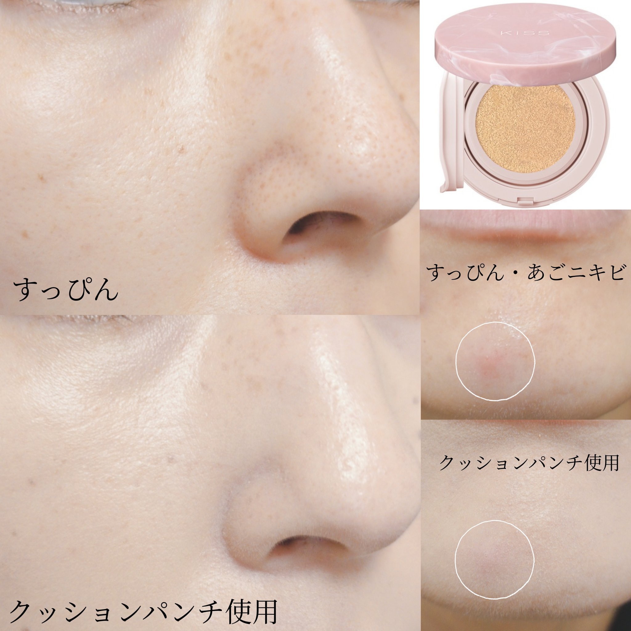 ハイカバーなのに薄膜!?KiSSクッションパンチ✔️毛穴・凹凸を補正する「ソフトフォーカスパウダー」✔️肌悩みを隠す「ハイカバーピグメント」✔️明るいトーンに整える「カラー補正ピグメント」の3つの組み合わせにより、ハイカバーと透明感を両立した...