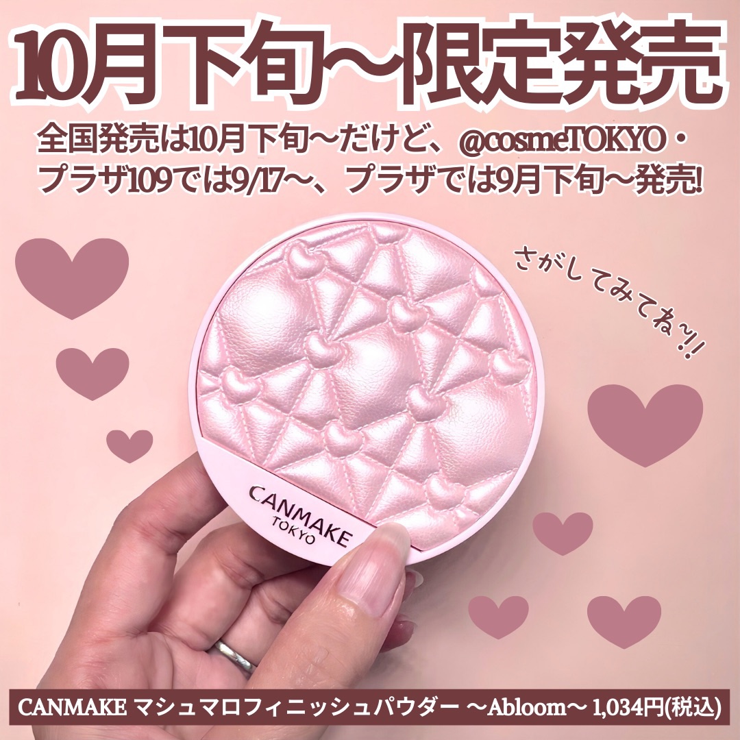 CANMAKEキャンメイクまたまた可愛いパッケージ登場♡マシュマロフィニッシュパウダー ~Abloom~01数量限定キルティング調容器1,034円(税込)さわるとふかふかのハートキルティング仕様こんな可愛いパケ買うしかない!!@cosmeTO...