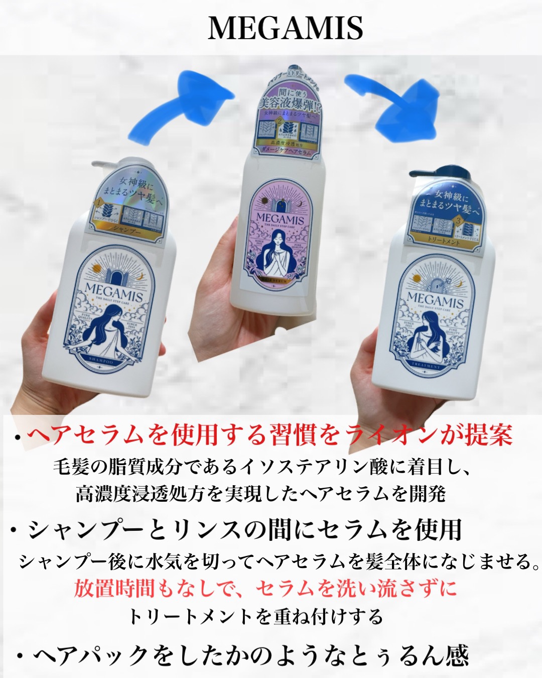 MEGAMISさまからいただきましたMEGAMISシャンプー・ヘアセラム・トリートメントをお試しさせていただきました。「ひらく」「いれる」「とじる」の3ステップヘアケア。デザインもおしゃれで特別感があります。シャンプーはしっとりしたテクスチャ...