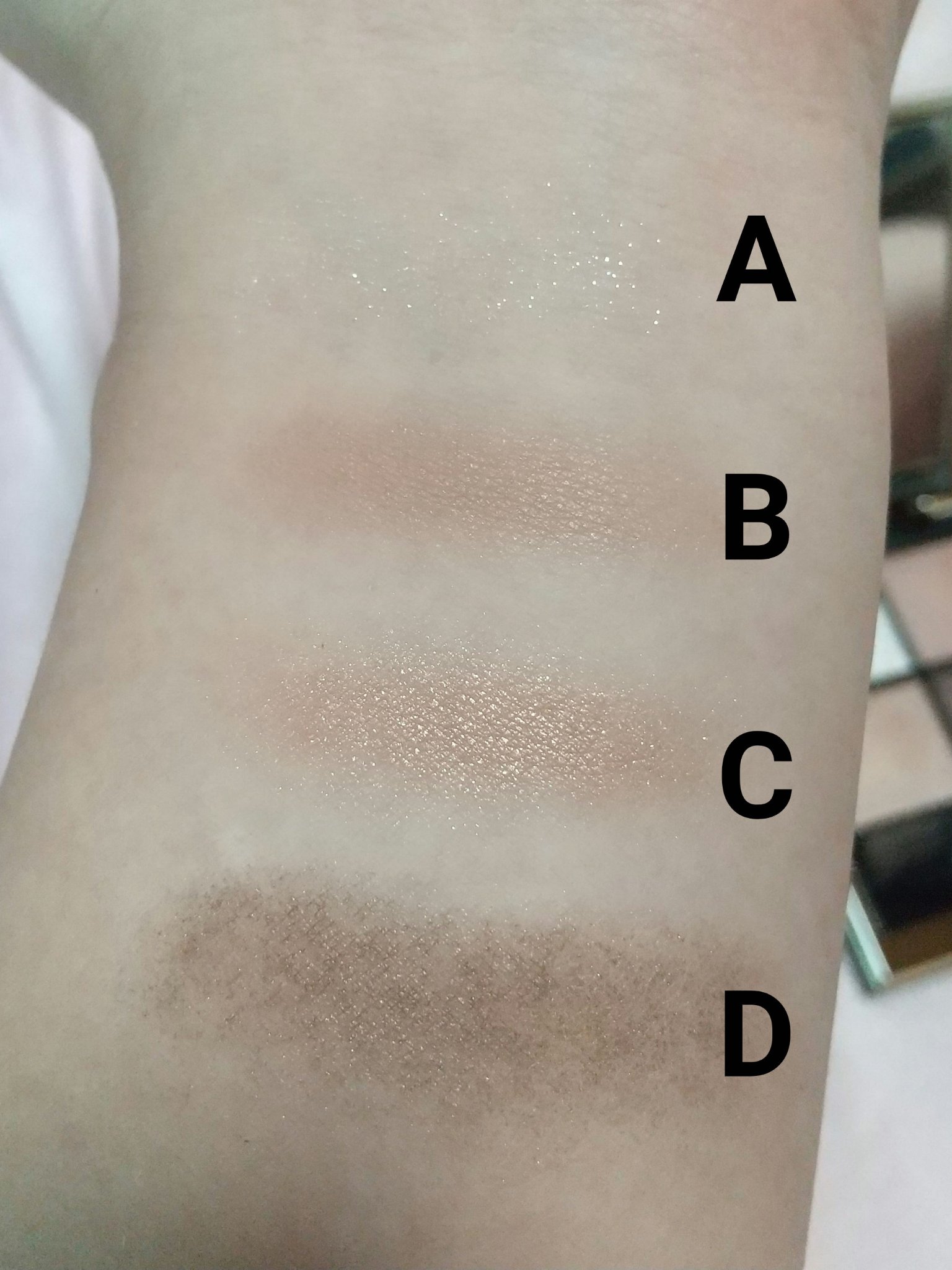 左上、左下、真ん中上、真ん中下、右上、右下という順番でスウォッチしてみました。 出してみると商品の写真より肌にのせたほうがくすみが出るかな✨という印象です😌 伸ばしやすくて指でも筆でもつけやすいです☺️💕 とっても可愛いカラーなのでオススメです💠