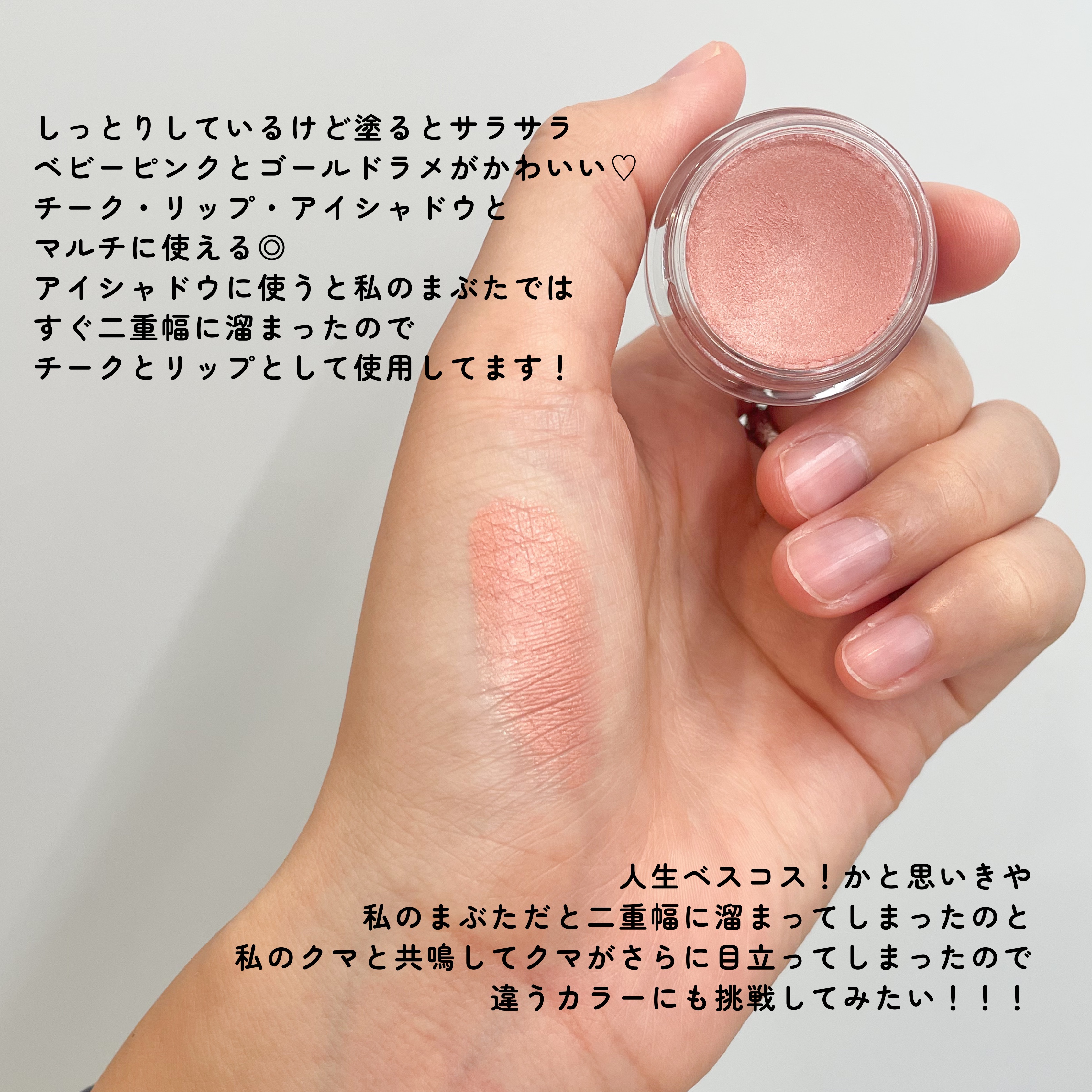 微細なホワイトパールが濡れたようなツヤを生み出すピーチカラー。スキントーンになじむヌーディなニュアンスで、表情にピュアな血色感を◎ ナチュラルかつ上品なツヤと血色感をプラスしてくれるマルチユースクリームカラー ✨ チークとしてだけでなく、アイシャドウ・リップとしても使えるので便利☝️