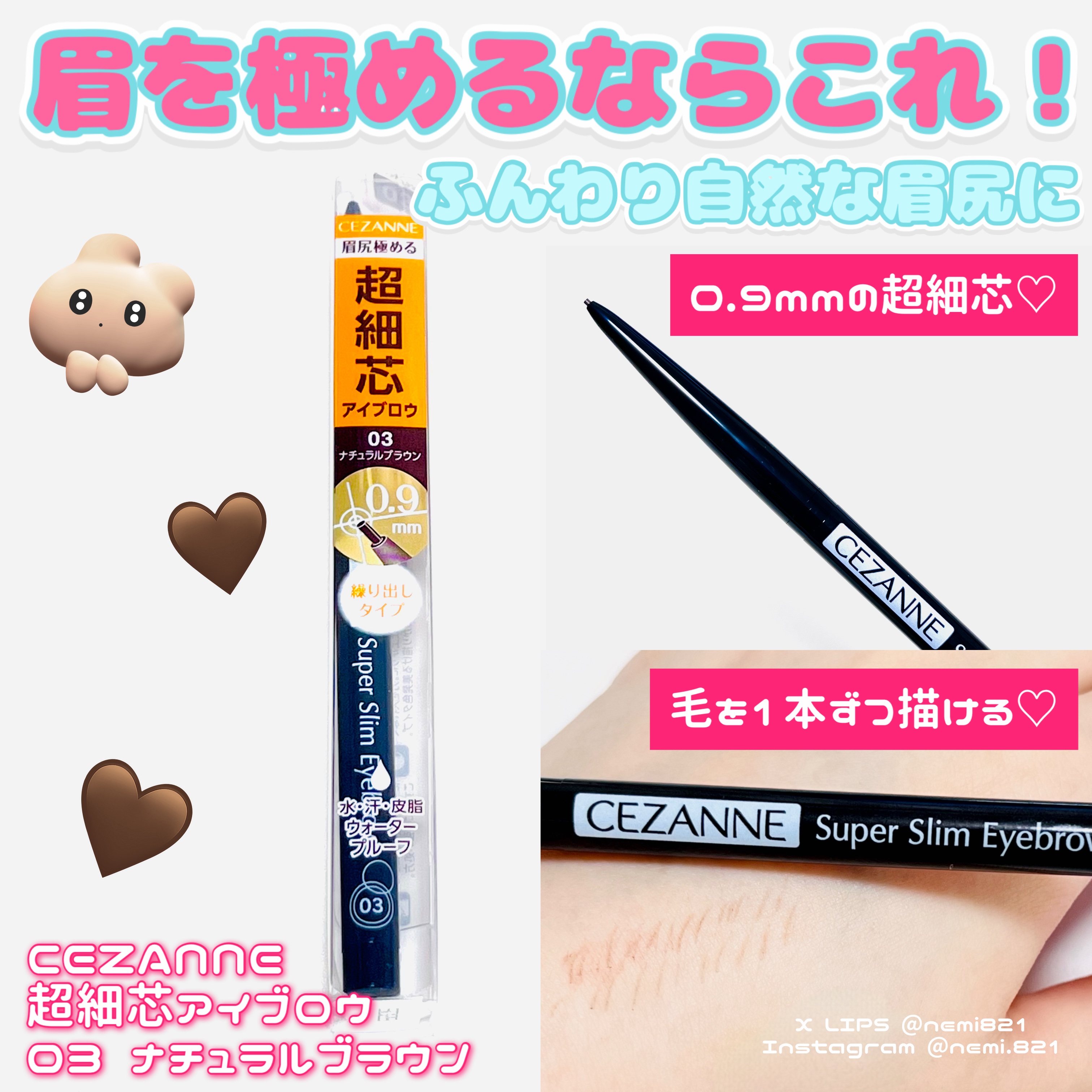 何度もリピートしているお気に入りアイブロウ! 眉毛1本1本を丁寧に描ける0.9mmの超極細芯で、眉尻も繊細に描けます。 03 ナチュラルブラウンは、どんな髪色にも合わせやすい万能カラーで使いやすいです。描きやすくてとにかく自然に仕上がるところが大好き◎ 水・汗・皮脂に強く落ちにくい処方です。プチプラでドラッグストアなどでも手軽に買えるのでおすすめ♪