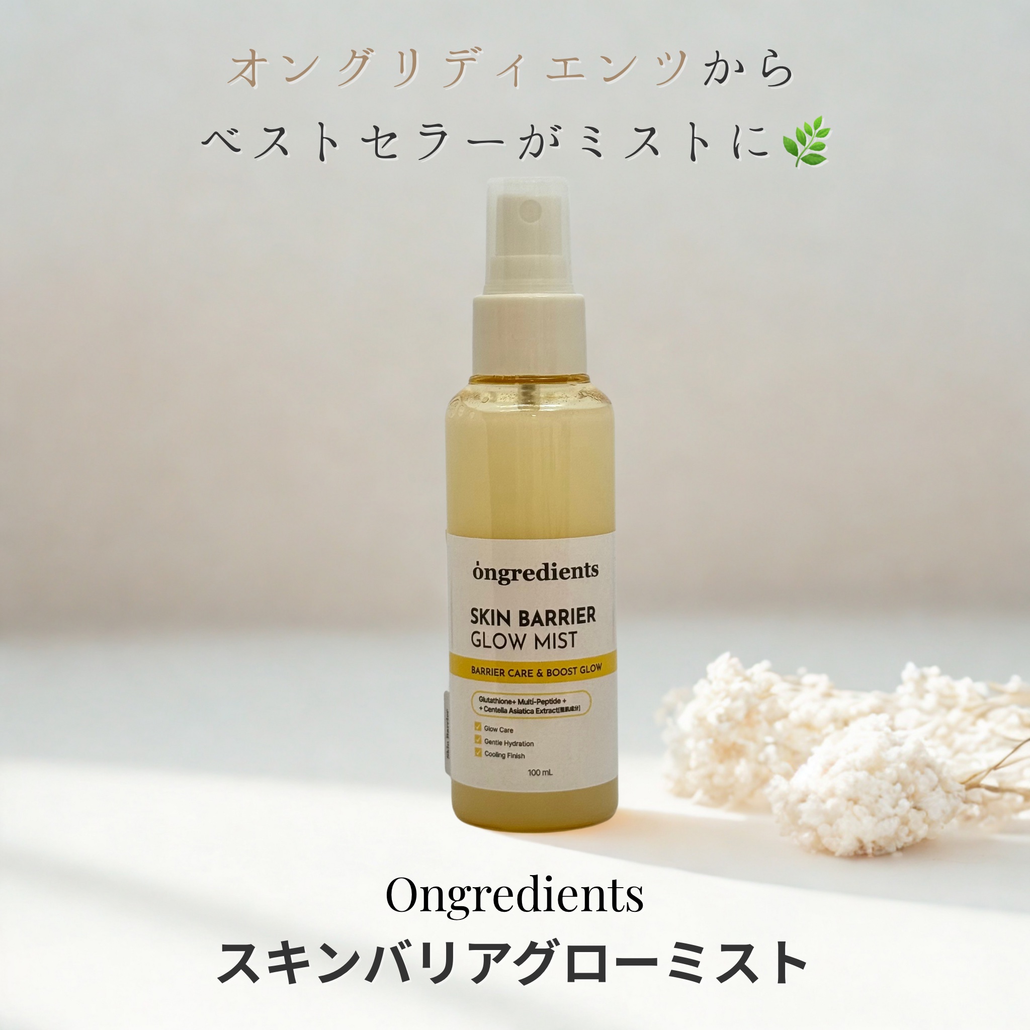 - 「ongredients(オングリディエンツ)」が、ついに日本のオフライン店舗に登場! <2025年8月30日(土)(※1)より全国のプラザ、ドン・キホーテ(※2)にて先行販売を開始> 水光トナーと水分グロウ成分が融合し、まるでハイライトを施したようなツヤ肌ミストを実現 【主要成分】 ・ツボクサ葉エキス(※3) 外的刺激を受けた肌を落ち着かせ、肌バリア(※4)機能を守ります。 ・複合ペプチド(※5) 肌のコンディションを整え、ハリのある肌印象へと導きます。 ・ヒアルロン酸(※6)&パンテノール(※7) 乾燥した肌を保湿ししっとり健やかに整えます。 【こんな方におすすめ】 ・外的刺激による肌のゆらぎが気になる方 ・保湿とキメのダブルケアをしたい方 ・\メイクの上からでも!/外出先でも、肌にうるおいを与えたい方 (※1)店頭開始日となり、購入可能日は各店舗により異なります。 (※2)一部店舗を除きます。 (※3)鎮静成分 (※4)角質層のうるおいを保つこと (※5)トリペプチド-1銅,トリペプチド-1,パルミトイルトリペプチド-1,パルミトイルペンタペプチド-4,ヘキサペプチド-11,ヘキサペプチド-9 (※6)ヒアルロン酸Na,ヒアルロン酸クロスポリマーNa,ヒアルロン酸K,ヒアルロン酸ヒドロキシプロピルトリモニウム,加水分解ヒアルロン酸Na,加水分解ヒアルロン酸,ヒアルロン酸(保湿成分) (※7)保湿成分