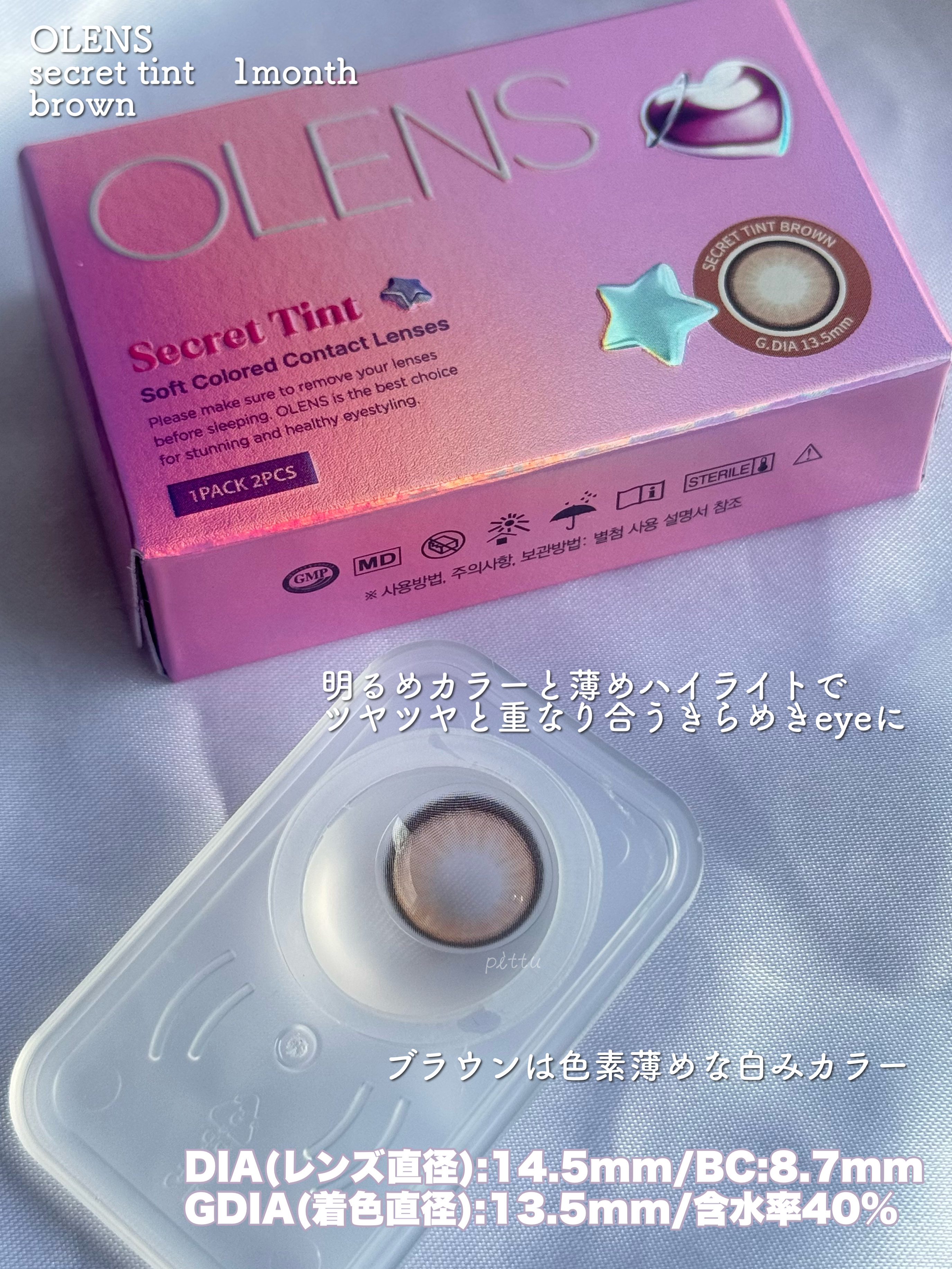 重なり合うきらめきが可愛すぎる୨୧OLENSSecretTintGraySecretTintBrownどっちも縁どりはっきりしてて、お目目大きく見えるカラコン♡DIA14.5mm着色直径13.5mmなんだけど、結構大きく見てるのは明るめのカラ...