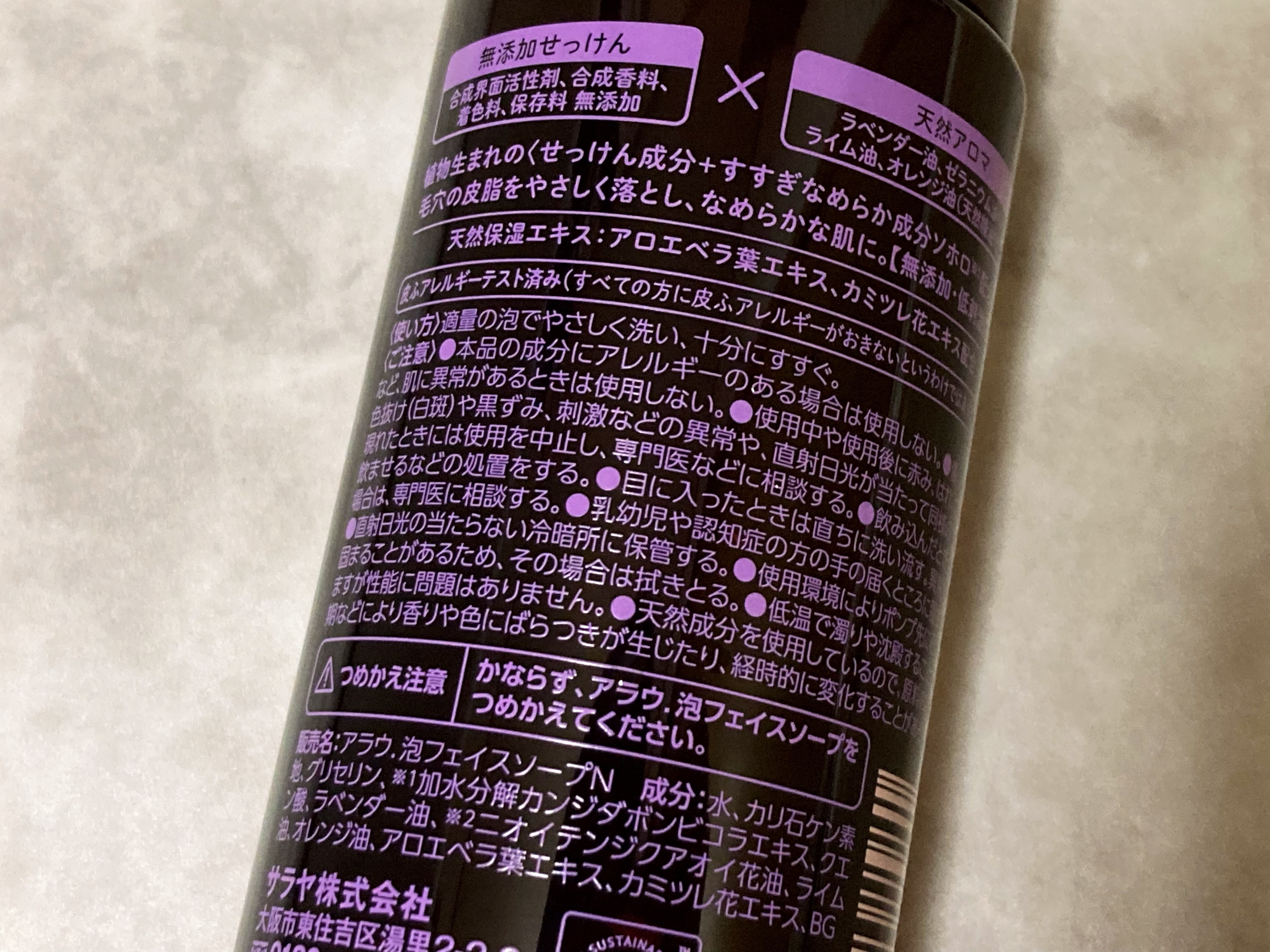 - <本体150mL> 水、カリ石ケン素地、グリセリン、加水分解カンジダボンビコラエキス、クエン酸、ラベンダー油、ニオイテンジクアオイ花油、ライム油、オレンジ油、アロエベラ葉エキス、カミツレ花エキス、BG <詰替150mL> 水、カリ石ケン素地、グリセリン、加水分解カンジダボンビコラエキス、クエン酸、ラベンダー油、ニオイテンジクアオイ花油、ライム油、オレンジ油、アロエベラ葉エキス、カミツレ花エキス、BG