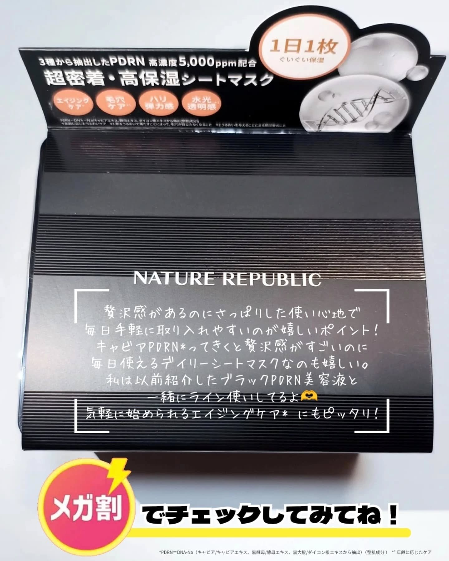 [大人の肌悩みに🖤]▶︎NATUREREPUBLIC(@naturerepublic_jp)▷ブラックPDRNデイリーシートマスク年齢肌サインが気になってきたら!キャビア由来のPDRN*配合🖤高濃度PDRN*に加えてヒアルロン酸やコラーゲ...