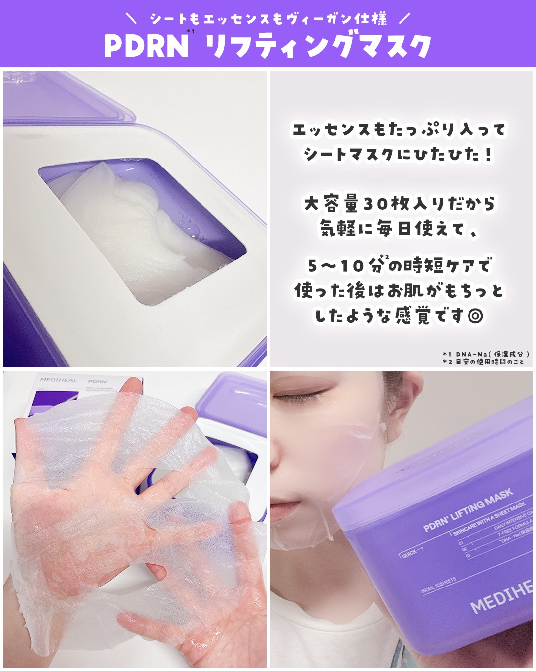 ー毎日5分の"ちょい贅沢"💜ハリ・毛穴・くすみに集中ケア!🏷MEDIHEAL▫PDRNリフティングマスク(30枚)5分でスキンケアが完了するから忙しい日こそ本気で助かる"時短リフティングマスク"💜植物性PDRN×レチノール×花エキスの組み合わ...