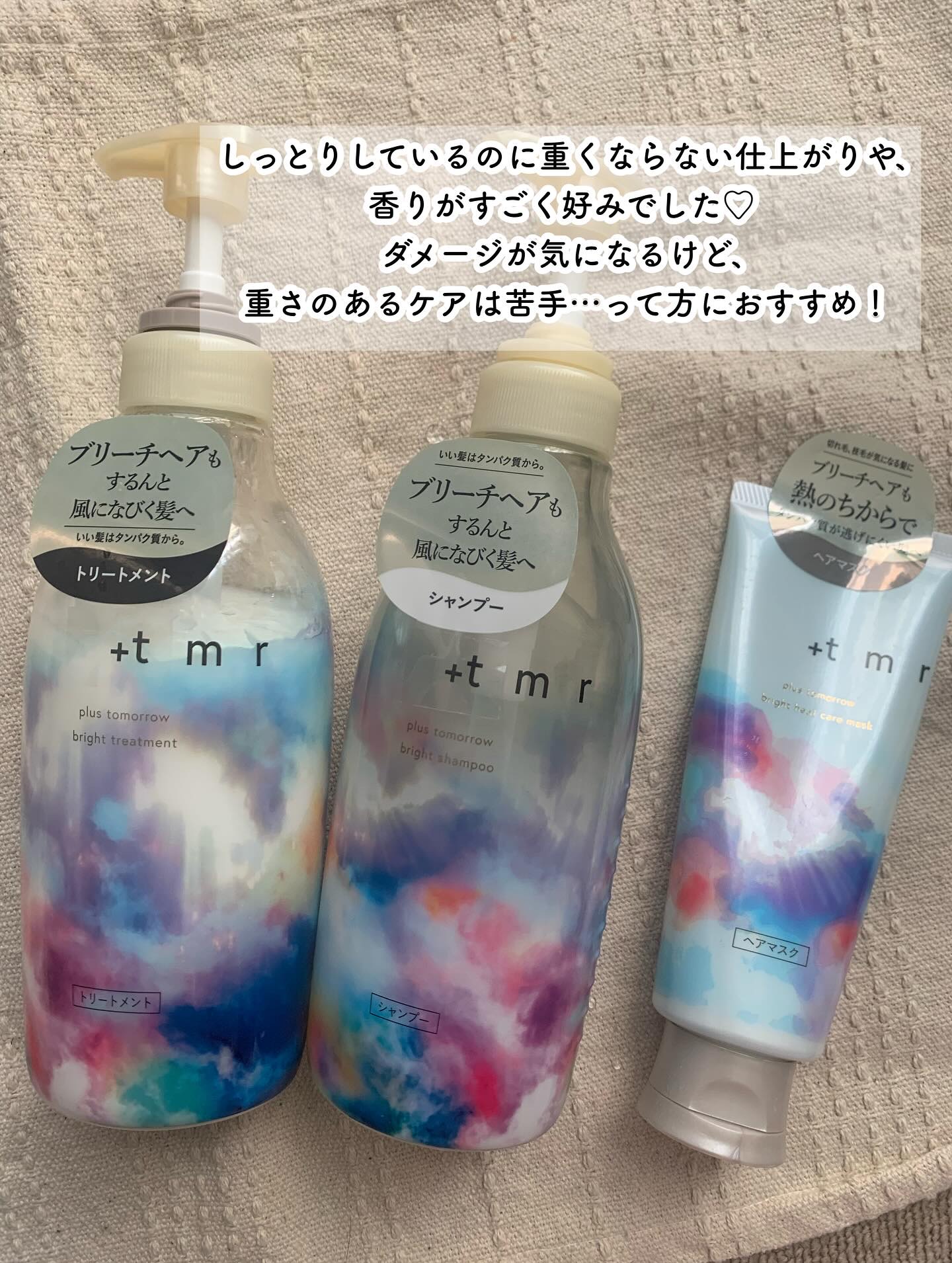 プラストゥモローさまからいただきました。+tmrブライトシャンプー/ブライトトリートメント/ブライトヒートケアマスクハイダメージ毛×タンパク質ケアに着目した新シリーズが登場✨ダメージを修復しつつ、ケアを重ねることで重く仕上がりがちなブリーチヘ...