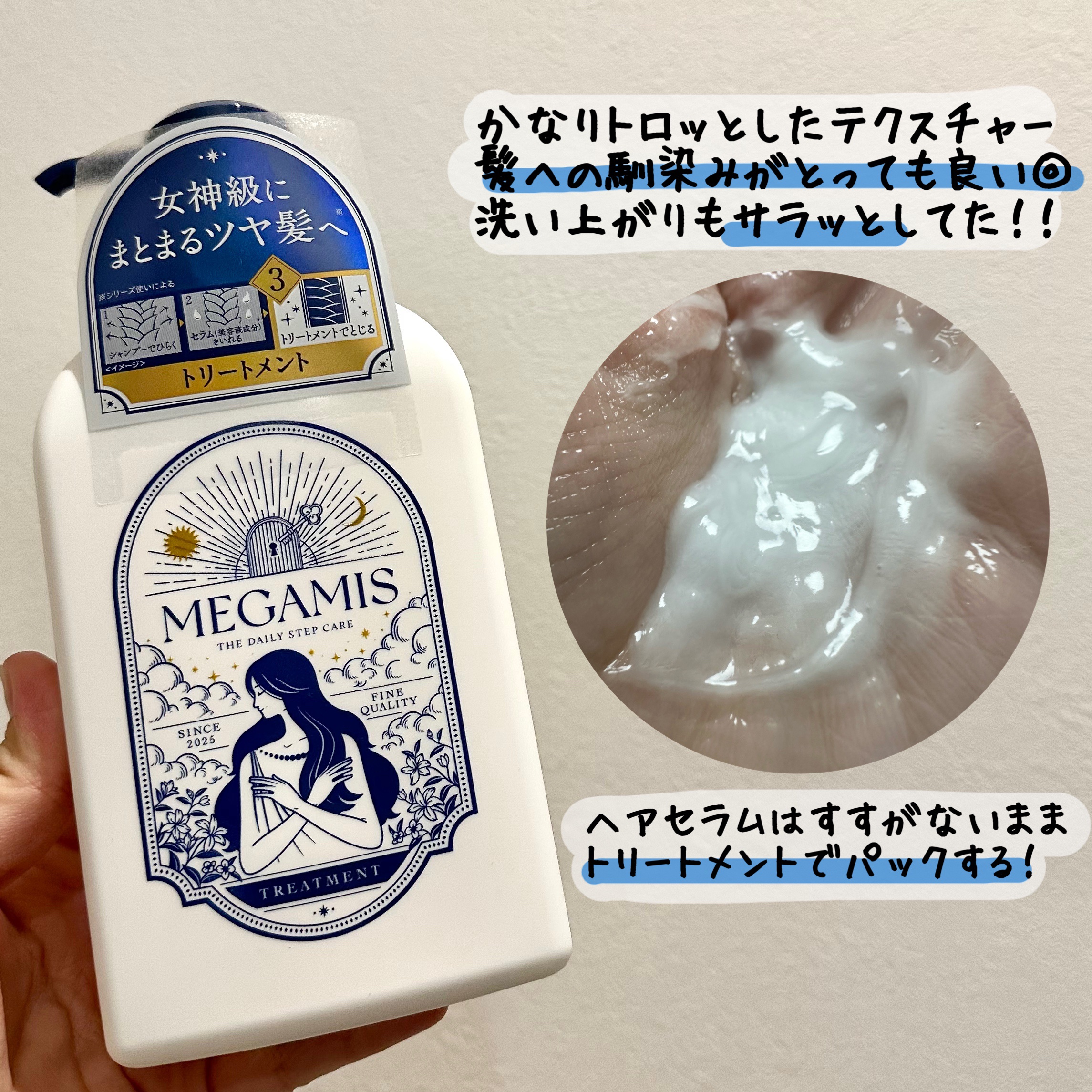 MEGAMISさまからいただきましたMEGAMISシャンプー・ヘアセラム・トリートメントをお試しさせていただきました。「ひらく」「いれる」「とじる」の3ステップヘアケア。デザインもおしゃれで特別感があります。シャンプーはしっとりしたテクスチャ...