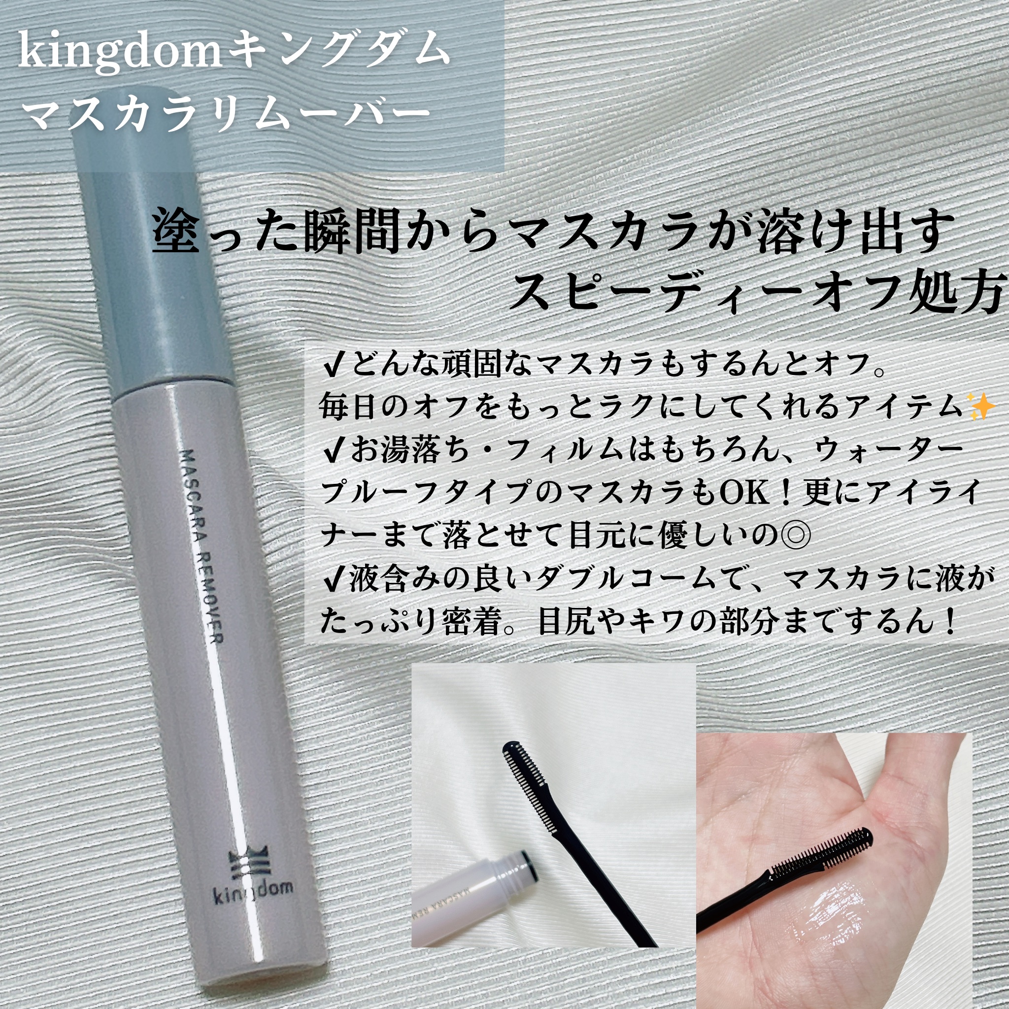 キングダムマスカラリムーバー束感マスカラのキングダムからマスカラリムーバーがついに登場どんなに頑固なマスカラも塗った瞬間溶け落とし"するんとオフ。"を叶えてくれるリムーバー▶︎まつげをとかしやすいダブルコーム液含みの良いコームでマスカラに液が...