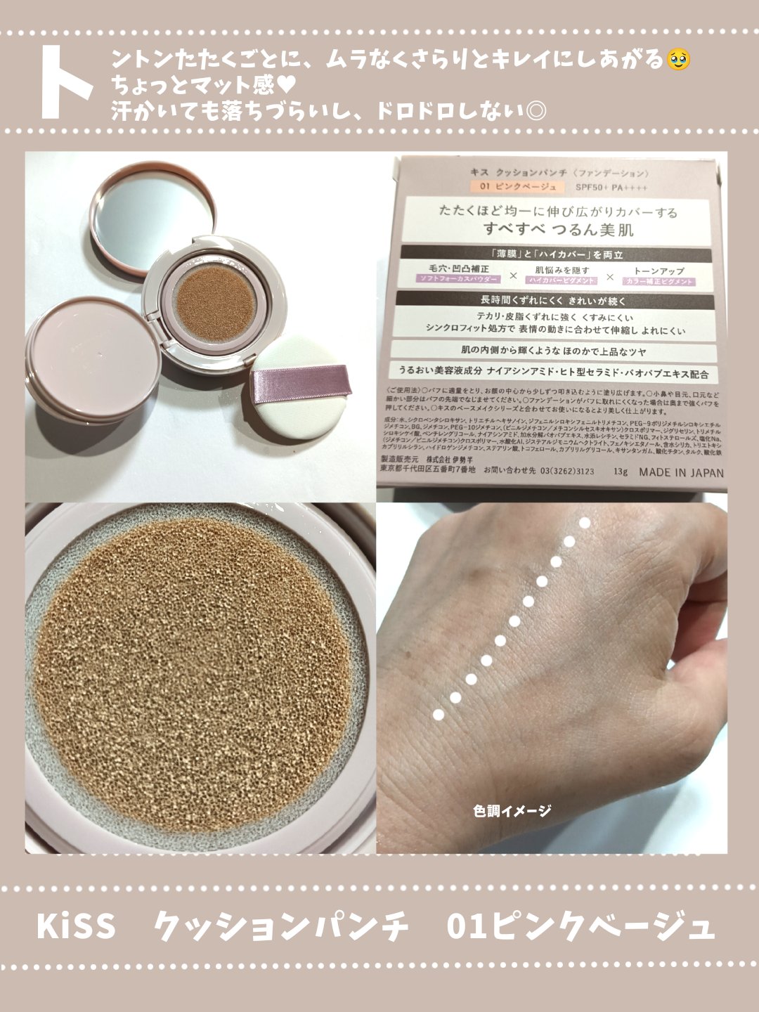 #残暑を乗り切る鉄板ベース薄膜とハイカバーを両立し、すべすべつるん美肌を叶える!KiSSクッションパンチ02ライトオークルニュートラルな明るい肌色ピンク大理石調な可愛いパケ♡目・小鼻周りを仕上げやすいドロップ型のもちふわ素材の独自パフ。トント...