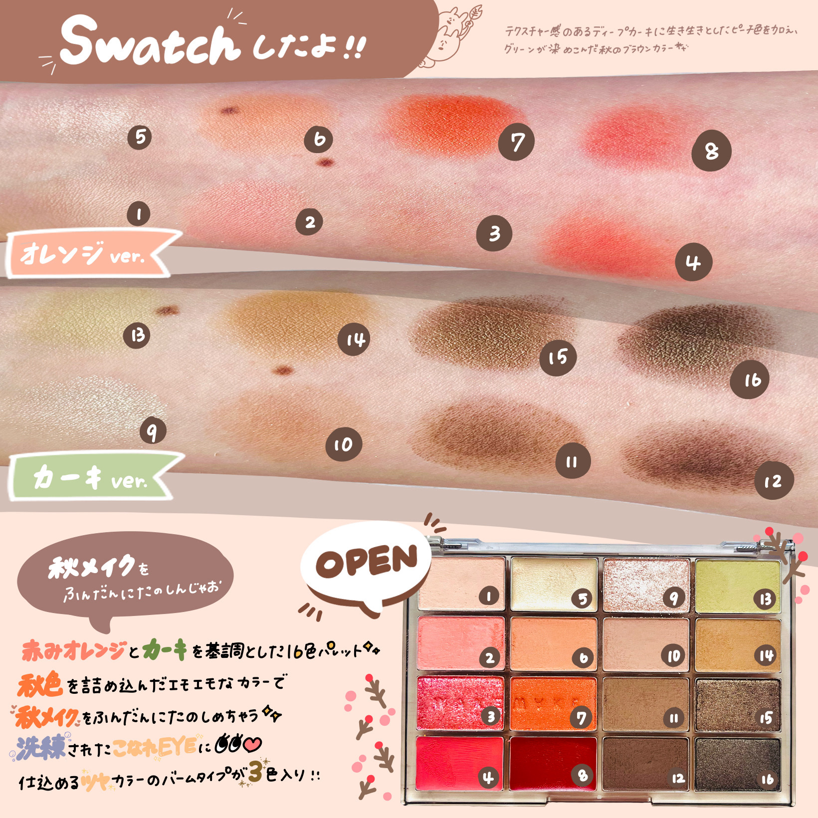 - 多彩なパーソナルカラーを基盤に作られたソフトブラーリングアイパレットで、16色を入れる事で、パレット1つでどんなメイクにもチャレンジできる形状が細長く持ち運びにも便利なパレット。 目元にやさしい使用感で広がり粉の飛び散りが少なく、しっかりと密着し染み込むように自然に馴染むテクスチャーが特徴。