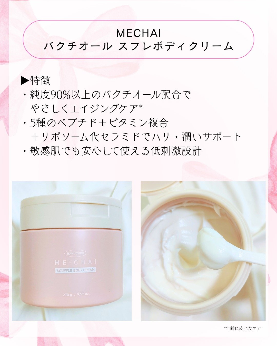 #推し成分で乗り切る夏@mechai_jp✼••••✼MECHAIバクチオールスフレボディクリーム✼••••✼乾燥で荒れた肌のための高機能なボディクリームです😊肌刺激の少ない純度90%以上のバクチオール配合でテクスチャーはふわふわ、使用感はベ...