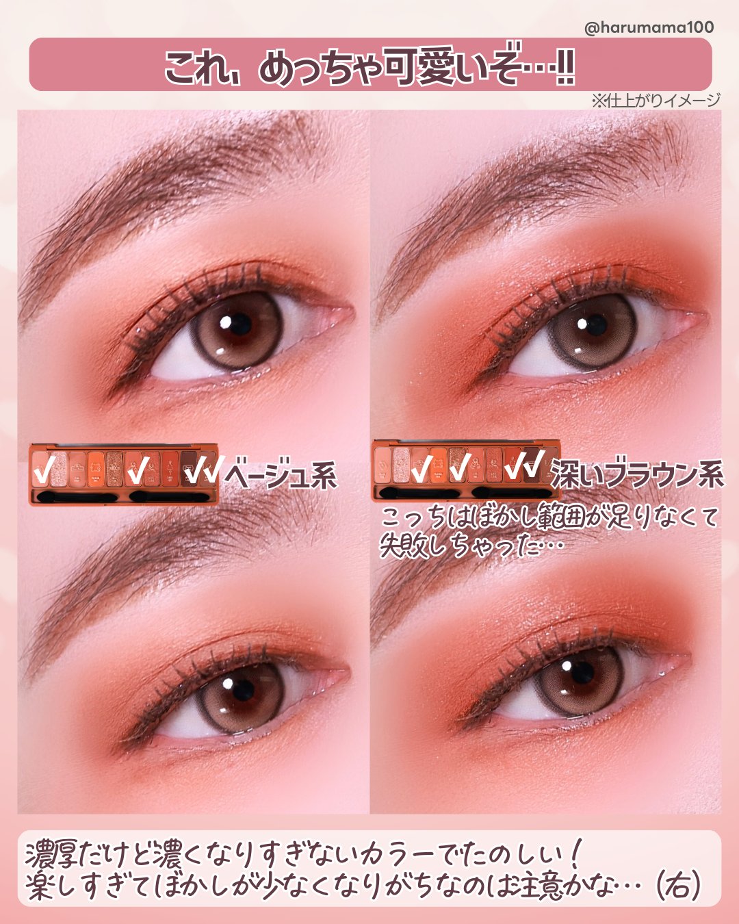 - 肌なじみの良い、鮮やかな発色で目元を華やかに彩る捨て色なしの10色アイシャドウパレット 異なる3種のテクスチャーを自由に組み合わせて、グラデーションも思いのままに。 NEW 2023.4 ・肌トーンにあう配色を詰め込んだトレンドカラー 肌トーンに合わせて、自分に似合うトレンドカラーが楽しめる♡ パーソナルカラー×トレンドカラーの掛け合わせパレットで、デイリーメイクもスペシャルメイクも気分にあわせてなりたい自分に! ・むにゅっとジェル質感ラメで高密着、煌めく目元 パレットの中でもポイントとなる大きめ粒子のラメは、ジェルのような新質感で落ちにくく肌にぴったりと密着します。キラキラとした目元をキープします。 ・使うカラーは大きめに!リアル捨て色なしパレット ベースやラメのよく使うカラーと締め色や濃い色等の減りが少ないカラーを異なるサイズで詰め込んだ、リアル捨て色なしパレット! <使用方法> 付属のデュアルシャドウブラシでベースカラーをまぶた全体に塗り広げます。細いブラシでグラデーションや目尻、アイライン、涙袋などのポイントカラーをのせて仕上げます。