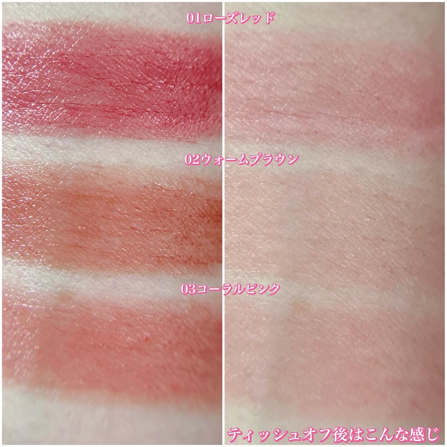 透明感が爆誕するブルベ向きカラー!ピンクも明るめで全体的に使いやすく早速お気に入り! このアイシャドウプチプラの中でお気に入りなのでこれからも新作でたら買ってしまうと思いますw ぷにっと質感が病みつきなバズりフェイスカラーのローズピンク系! 02はどちらかと言うとブルベ向きカラーではあるもののなじみがよく万人に使えるカラー!