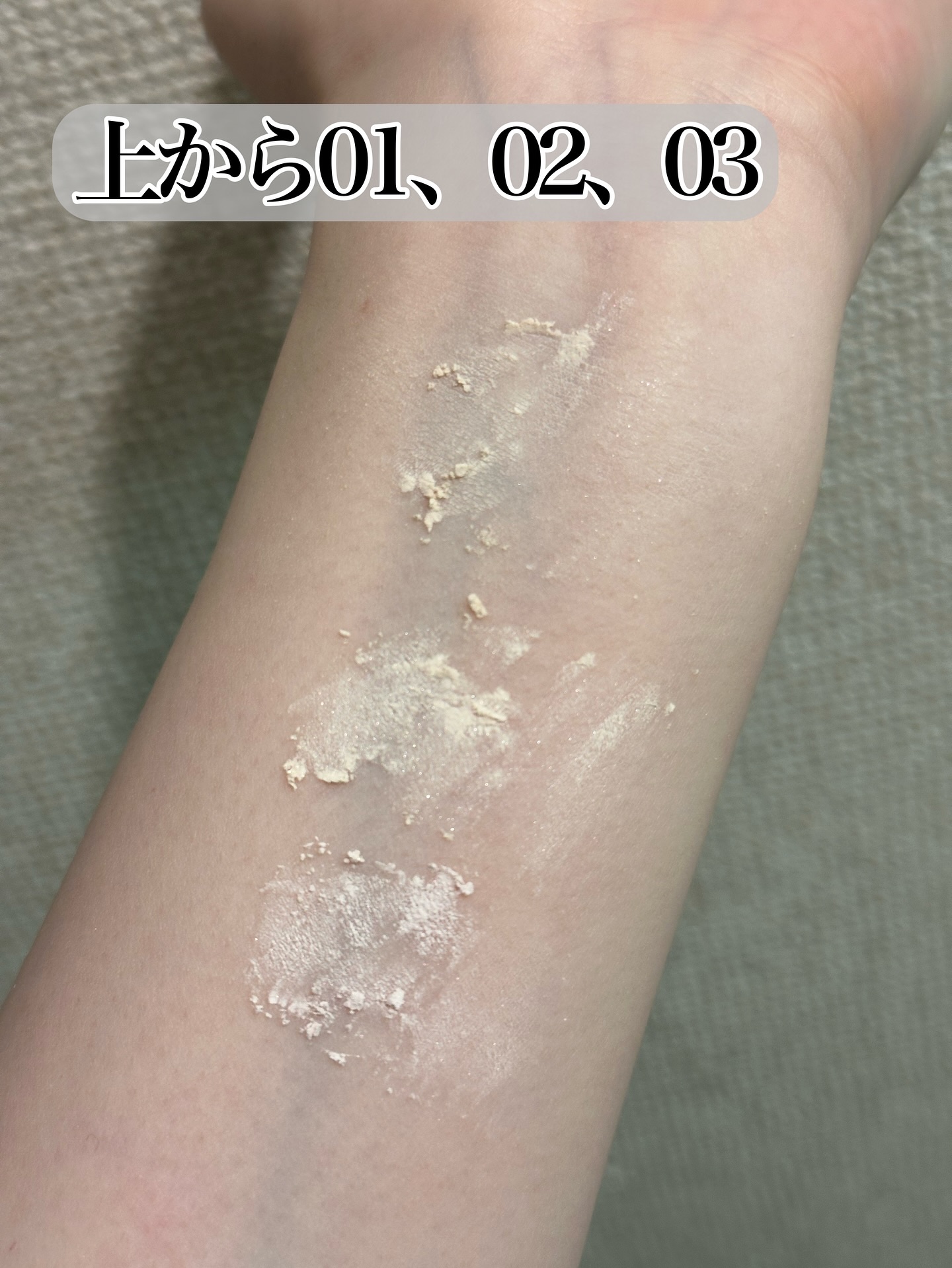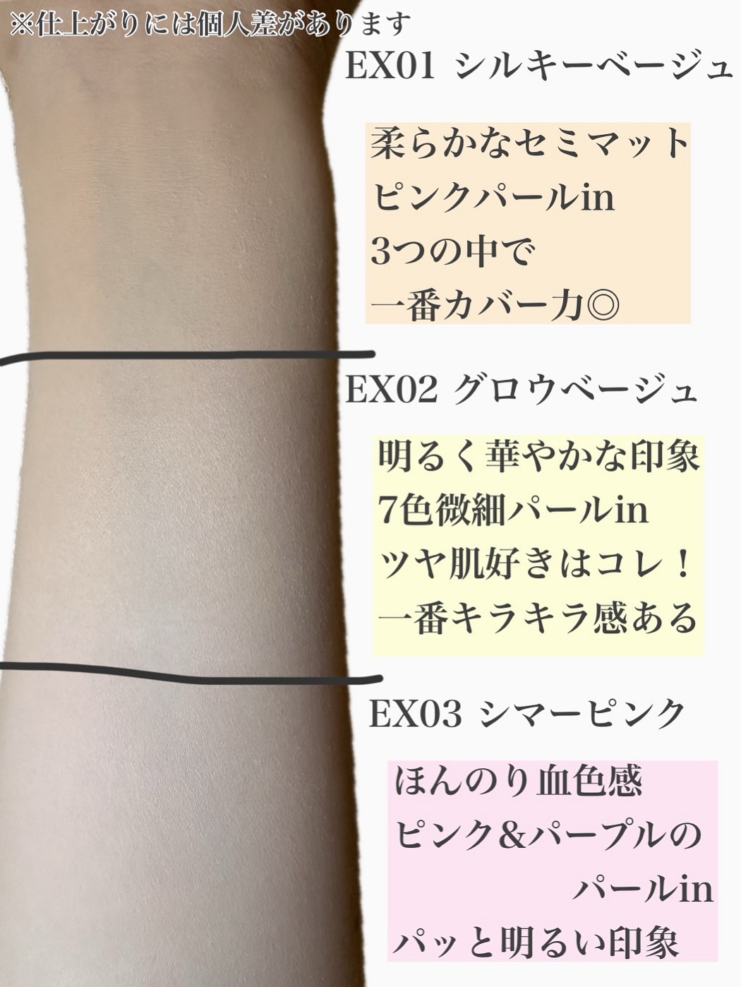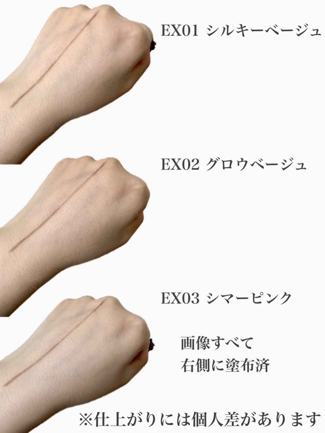 - <EX01 シルキーベージュ> (ビニルジメチコン/メチコンシルセスキオキサン)クロスポリマー、窒化ホウ素、ラウリン酸亜鉛、シリカ、ジラウロイルグルタミン酸リシンNa、塩化Mg、コメヌカスフィンゴ糖脂質、コメヌカ油、シクロデキストリン、ナイロン-12、シルク、オクテニルコハク酸デンプンAl、ジメチコン、合成フルオロフロゴパイト、酸化スズ、シア脂、硫酸Ca水和物、セチルPGヒドロキシエチルパルミタミド、水酸化Al、ハイドロゲンジメチコン、ナイアシンアミド、パルミチン酸アスコルビルリン酸3Na、セラミドEOP、セラミドNG、セラミドNP、セラミドAP、ジペプチド-15、アゼロイルジグリシンK、ノイバラ果実エキス、エクトイン、パンテノール、アラントイン、グリチルレチン酸ステアリル、ツボクサエキス、ピリドキシンHCl、トコフェリルリン酸Na、ポリクオタニウム-51、スイゼンジノリ細胞外多糖体、シロキクラゲ多糖体、(HDI/トリメチロールヘキシルラクトン)クロスポリマー、1,2-ヘキサンジオール、BG、エチルヘキシルグリセリン、ジステアリン酸Al、ステアロイルグルタミン酸2Na、セバシン酸イソステアリル、トコフェロール、トリ(カプリル酸/カプリン酸)グリセリル、ヒドロキシアパタイト、フィトステロールズ、メチコン、ラウロイルリシン、水、水添レシチン、野菜油、フェノキシエタノール、メチルパラベン、(+/-)カオリン、グンジョウ、タルク、マイカ、酸化チタン、酸化亜鉛、酸化鉄 <EX02 グロウベージュ> (ビニルジメチコン/メチコンシルセスキオキサン)クロスポリマー、窒化ホウ素、ラウリン酸亜鉛、シリカ、ジラウロイルグルタミン酸リシンNa、塩化Mg、コメヌカスフィンゴ糖脂質、コメヌカ油、シクロデキストリン、ナイロン-12、シルク、オクテニルコハク酸デンプンAl、ジメチコン、合成フルオロフロゴパイト、酸化スズ、シア脂、硫酸Ca水和物、セチルPGヒドロキシエチルパルミタミド、水酸化Al、ハイドロゲンジメチコン、ナイアシンアミド、パルミチン酸アスコルビルリン酸3Na、セラミドEOP、セラミドNG、セラミドNP、セラミドAP、ジペプチド-15、アゼロイルジグリシンK、ノイバラ果実エキス、エクトイン、パンテノール、アラントイン、グリチルレチン酸ステアリル、ツボクサエキス、ピリドキシンHCl、トコフェリルリン酸Na、ポリクオタニウム-51、スイゼンジノリ細胞外多糖体、シロキクラゲ多糖体、(HDI/トリメチロールヘキシルラクトン)クロスポリマー、1,2-ヘキサンジオール、BG、エチルヘキシルグリセリン、ジステアリン酸Al、ステアロイルグルタミン酸2Na、セバシン酸イソステアリル、トコフェロール、トリ(カプリル酸/カプリン酸)グリセリル、ヒドロキシアパタイト、フィトステロールズ、メチコン、ラウロイルリシン、水、水添レシチン、野菜油、フェノキシエタノール、メチルパラベン、(+/-)カオリン、グンジョウ、タルク、マイカ、酸化チタン、酸化亜鉛、酸化鉄 <EX03 シマーピンク> (ビニルジメチコン/メチコンシルセスキオキサン)クロスポリマー、窒化ホウ素、ラウリン酸亜鉛、シリカ、ジラウロイルグルタミン酸リシンNa、塩化Mg、コメヌカスフィンゴ糖脂質、コメヌカ油、シクロデキストリン、ナイロン-12、シルク、オクテニルコハク酸デンプンAl、ジメチコン、合成フルオロフロゴパイト、酸化スズ、シア脂、硫酸Ca水和物、セチルPGヒドロキシエチルパルミタミド、水酸化Al、ハイドロゲンジメチコン、ナイアシンアミド、パルミチン酸アスコルビルリン酸3Na、セラミドEOP、セラミドNG、セラミドNP、セラミドAP、ジペプチド-15、アゼロイルジグリシンK、ノイバラ果実エキス、エクトイン、パンテノール、アラントイン、グリチルレチン酸ステアリル、ツボクサエキス、ピリドキシンHCl、トコフェリルリン酸Na、ポリクオタニウム-51、スイゼンジノリ細胞外多糖体、シロキクラゲ多糖体、(HDI/トリメチロールヘキシルラクトン)クロスポリマー、1,2-ヘキサンジオール、BG、エチルヘキシルグリセリン、ジステアリン酸Al、ステアロイルグルタミン酸2Na、セバシン酸イソステアリル、トコフェロール、トリ(カプリル酸/カプリン酸)グリセリル、ヒドロキシアパタイト、フィトステロールズ、メチコン、ラウロイルリシン、水、水添レシチン、野菜油、フェノキシエタノール、メチルパラベン、(+/-)カオリン、グンジョウ、タルク、マイカ、酸化チタン、酸化亜鉛、酸化鉄 <EX04 シマ―ラベンダー(限定)> (ビニルジメチコン/メチコンシルセスキオキサン)クロスポリマー、窒化ホウ素、ラウリン酸亜鉛、シリカ、ジラウロイルグルタミン酸リシンNa、塩化Mg、コメヌカスフィンゴ糖脂質、コメヌカ油、シクロデキストリン、ナイロン-12、シルク、オクテニルコハク酸デンプンAl、ジメチコン、合成フルオロフロゴパイト、酸化スズ、シア脂、硫酸Ca水和物、セチルPGヒドロキシエチルパルミタミド、水酸化Al、ハイドロゲンジメチコン、ナイアシンアミド、パルミチン酸アスコルビルリン酸3Na、セラミ