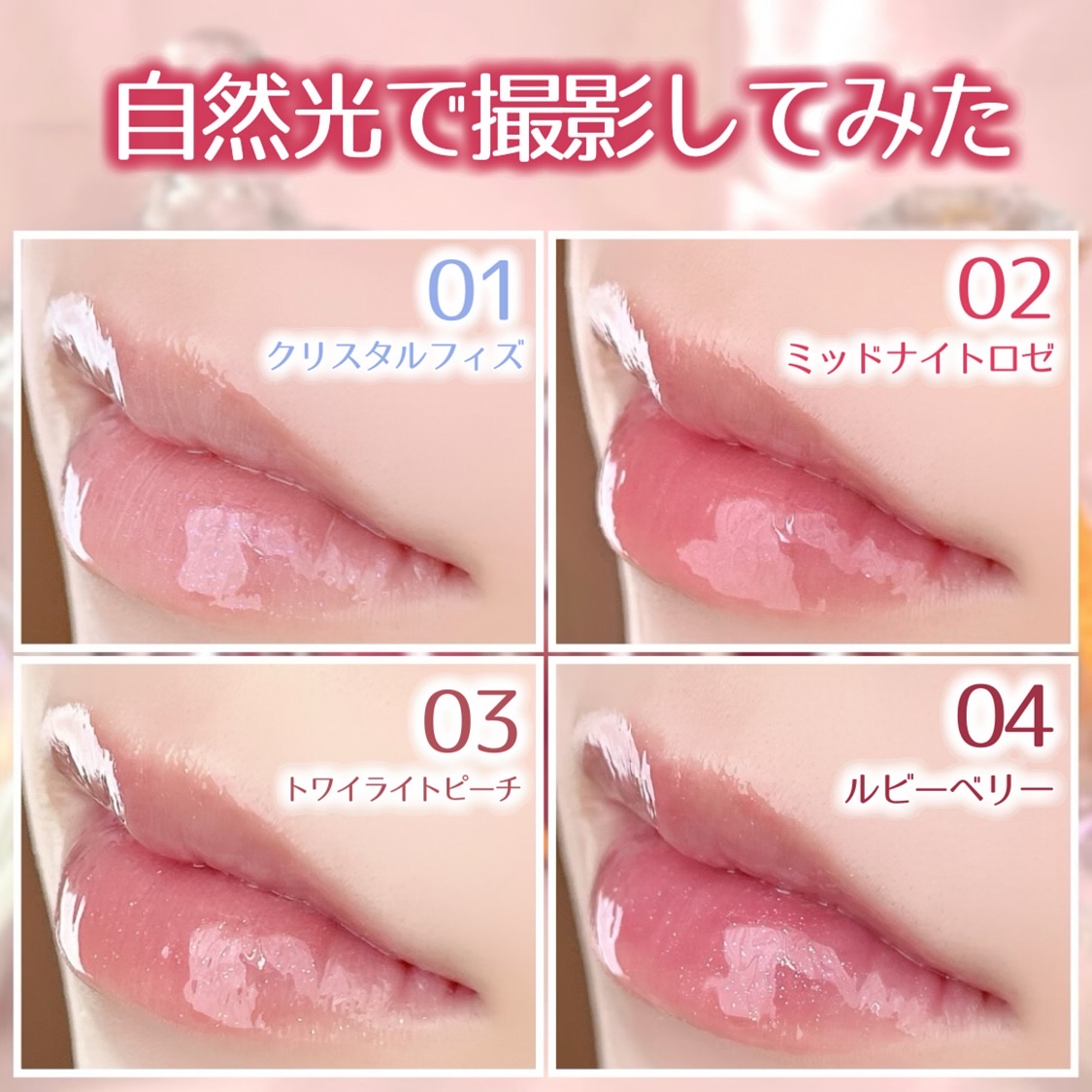 透明感があり、そこまで発色しませんがさりげなくて可愛いです😍ムチっとした柔らかいテクスチャで時間が経っても保湿力がありました✨ラメも細かいので、ラメ感というより艶出しです。チップも液も柔らかめなので、塗り心地はフニャリって感じです😆...