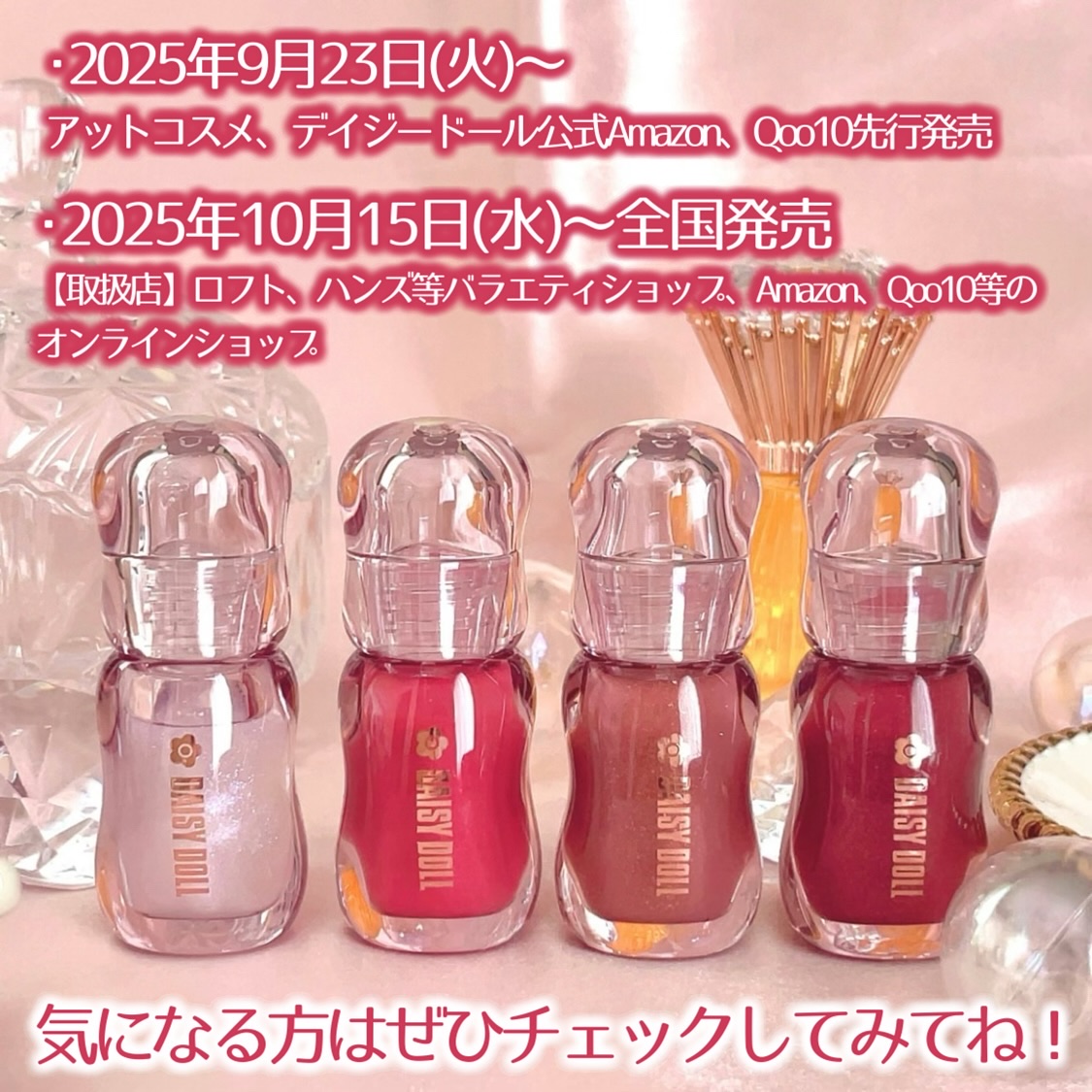 - デイジードールから、ジュエリーのようなきらめきと、シロップのようなツヤ感を与える、まるでパックのようなリップグロスが登場! ジュエリーのような輝きを放つたっぷりのラメと、シロップのようなとろけるツヤのベールが重なりあう、リップケア発想のグロスです。 「ラメ × ツヤ × ニュアンスカラー」のトレンド感あふれる絶妙な4色展開でぷるんとツヤめく理想の唇が長時間続きます。