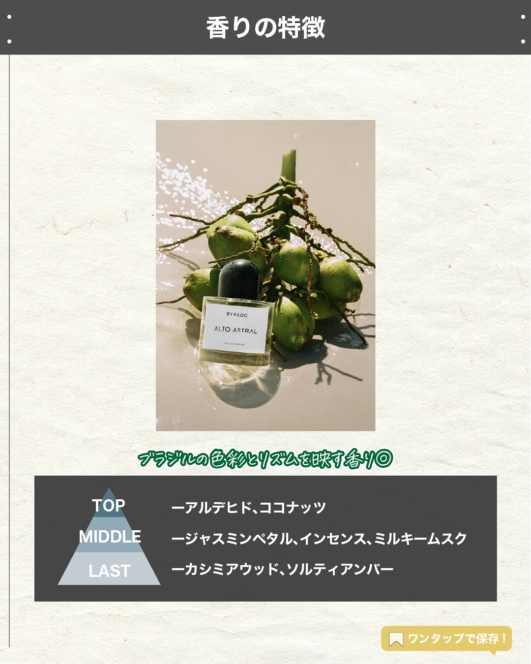 . 『人気香水 新作登場』 🌳製品情報🌳 BYREDO アルト アストラル オードパルファム 発売:2025年8月14日(木) 価格(税込):50ml 28,050円/100ml 39,930円 引用 BYREDO公式HP ファッションプレスHP -------------- エスログ┊1日1分のモテ香水紹介 @slog_bt ▷19時投稿 ▷毎月200万人が訪れる国内最大級の香水アカウント👑 -------------- #フレグランス #香水マニア #香水好き #香りフェチ #香り好きな人と繋がりたい #BYREDO #バイレード #ウッディ #ムスク