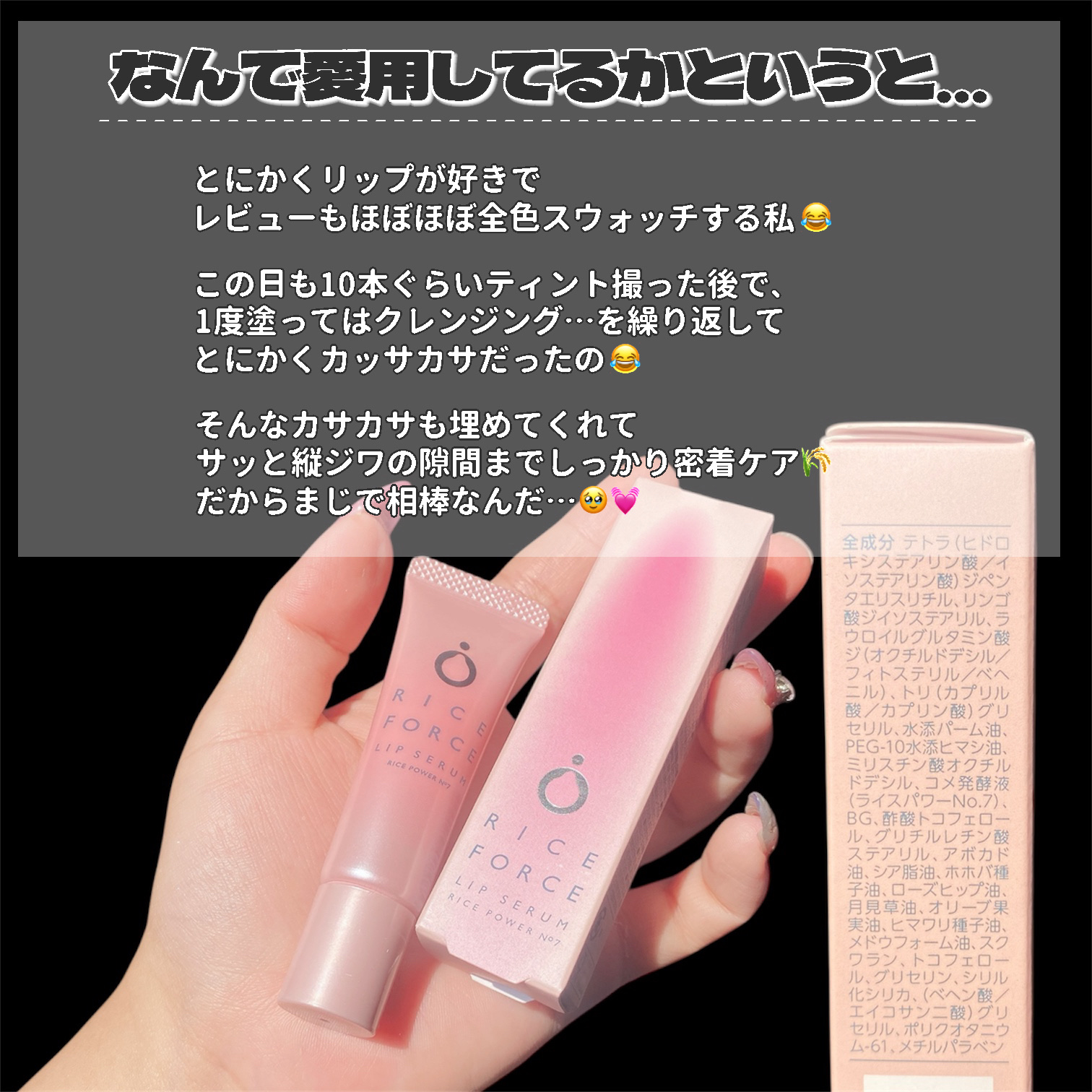かさつきが気になる季節、仕込むだけでうるつや唇になれるライスフォース リップセラム💄✨「ライスパワー®️No.7(保湿成分)」と9種類の植物由来オイル(すべて保湿成分)を贅沢に配合。スキンケア発想で、ふっくら感とツヤを与えてくれそうなところに...