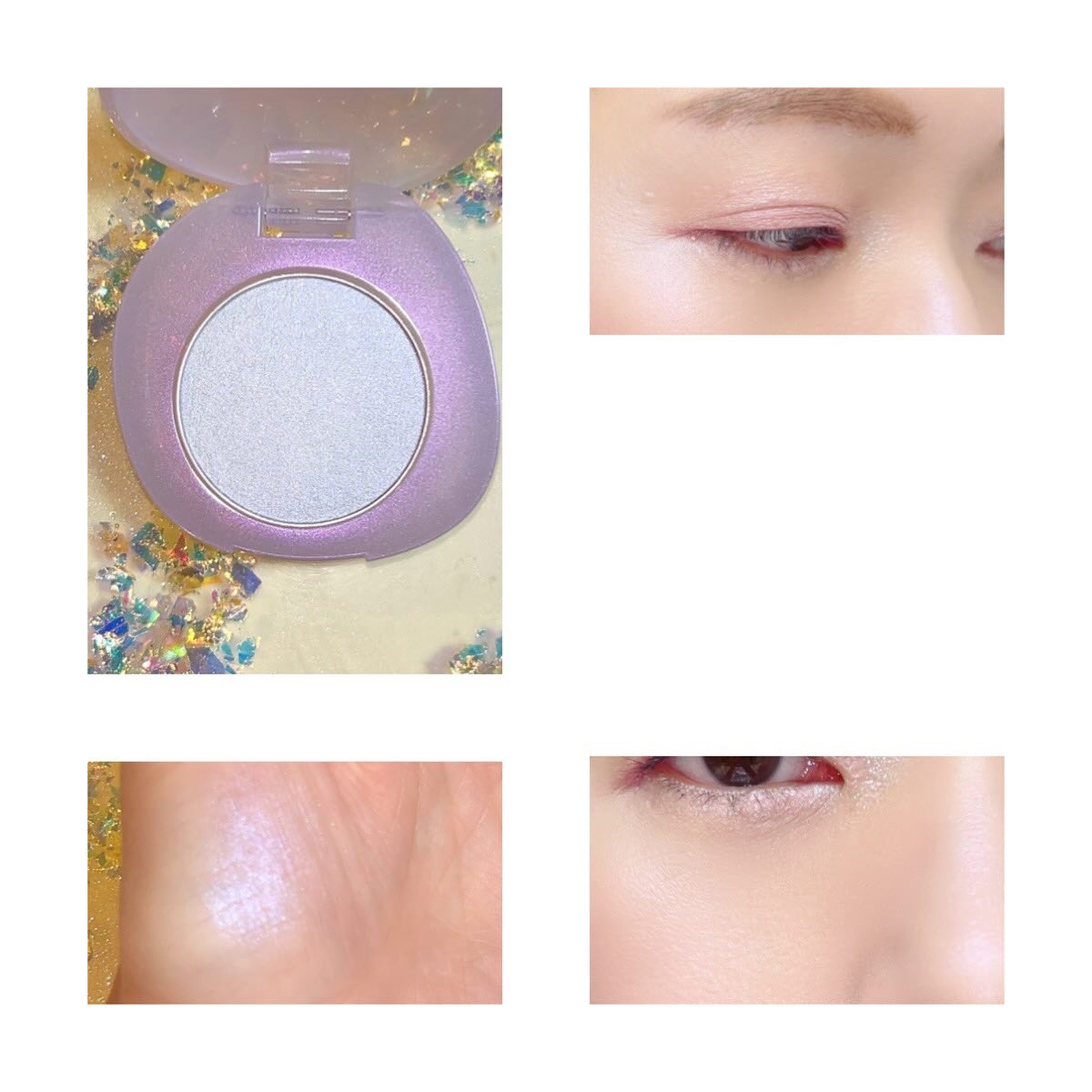 春カラーが好き🌸 春シーズンは欲しいものがたくさんでした。 左下のラメが繊細で綺麗✨ 公式通り、右上&左下をアイホール&下瞼、右下を目の際、左上をアイホールに重ねて。 アプリコット&ピスタチオというオシャレカラーで、繊細なラメ入り。 色持ちはよくて、食事後もしっかり色残りアリ。 縦皺も気にならないし、多分他のカラーも追加購入していくんだろうなぁ…🤣