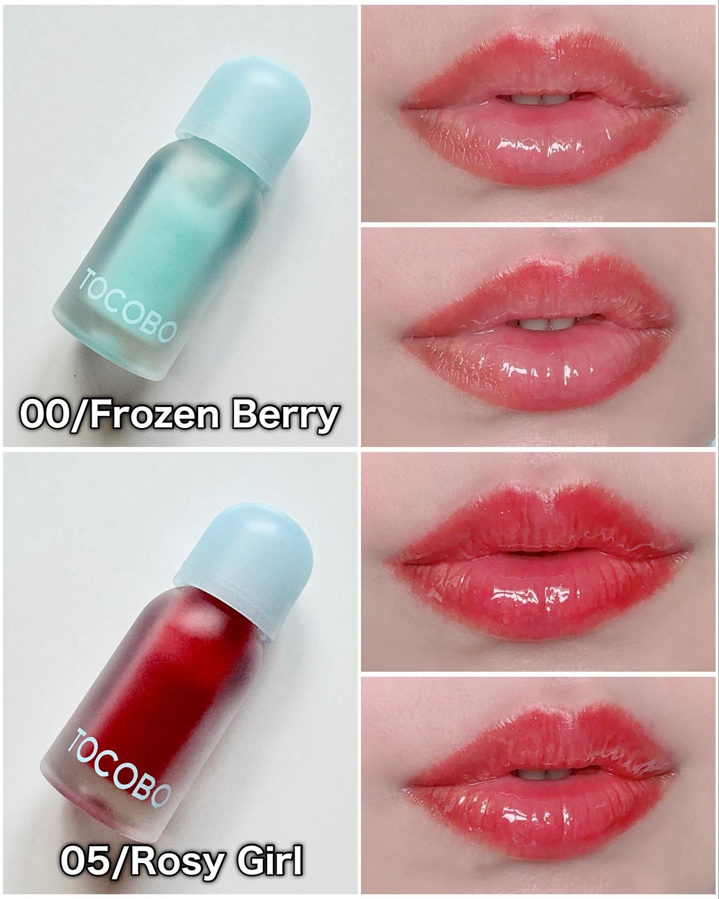 TOCOBO朝と夜で分けれるリップティント&リップマスクをレビュー!!ジューシーベリープランピングリップオイル05RosyGirl00FrozenBerry05はローズコーラルカラーで低刺激タイプのプランピングティント、00はプランピングでキ...
