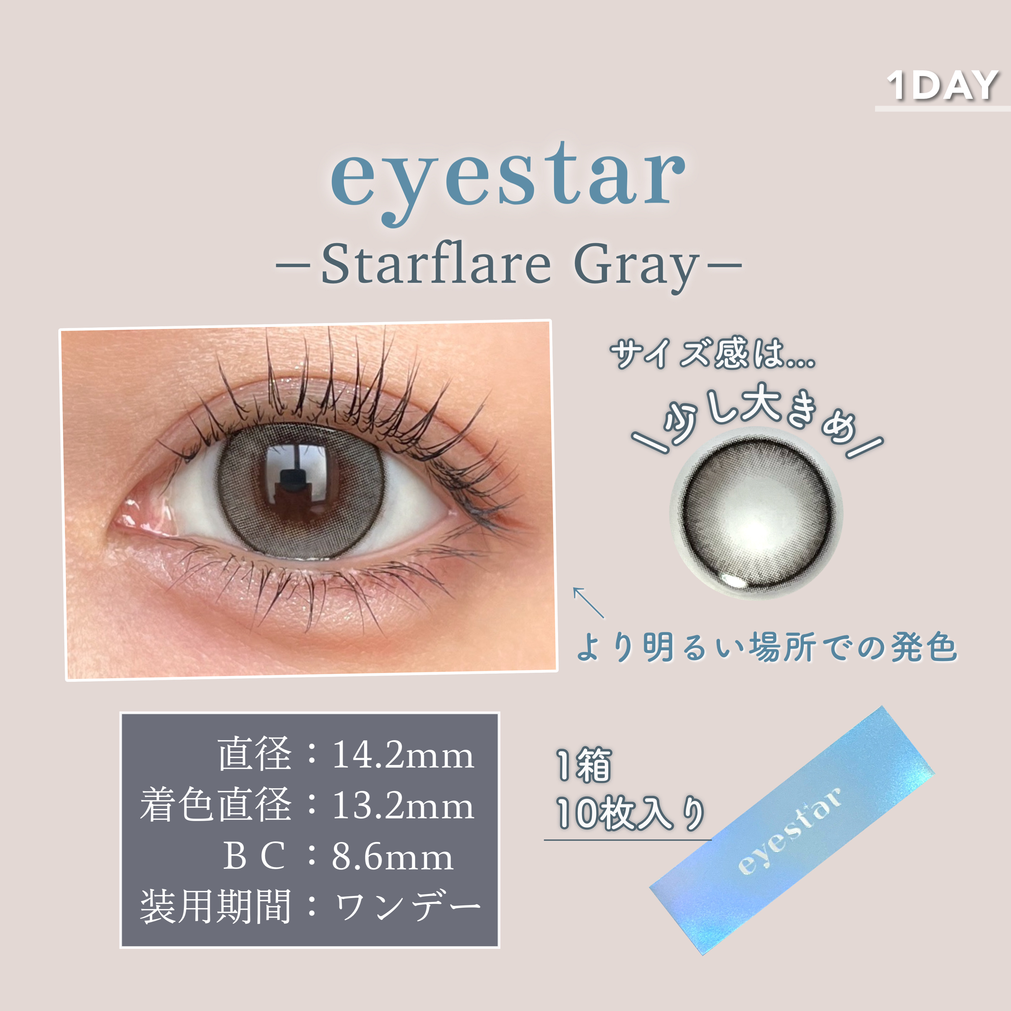 \eyestar2色レビュー/DIA:14.2mm着色直径:13.2mmBC:8.6mm・スターフレアベージュハイライトデザインで目元に光が✨ベージュが明るめに発色されるので抜け感も出ます😌・スターフレアグレーほんのり青みを感じるようなグレー...