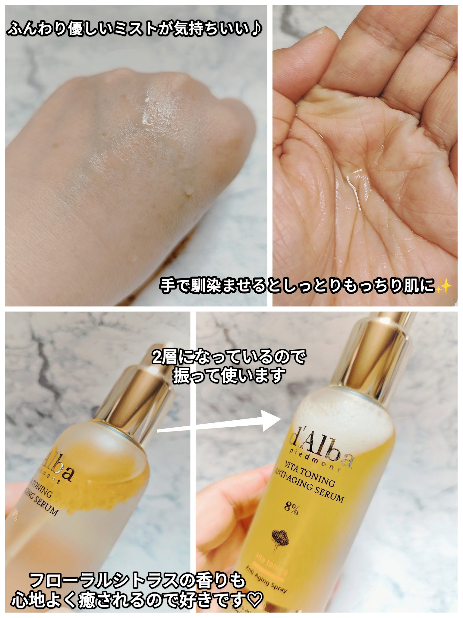 - 1. 黄金比率8:92の2層セラムミスト オイル8%、セラム92%の黄金比率で、栄養感あふれるツヤ肌を演出するダブルレイヤーミスト。 2. 2週間で目に見えるアンチエイジング効果 シワ25.81%、リフティング49.58%、肌トーン1.15%改善。 トーンケアからシワ改善までトータルにサポートする機能性ミスト。 3. ホワイトトリュフ*8%、コラーゲン水8%、保湿オイル8%配合 肌にしっかり密着し、揺るぎないハリを与えるスペシャルセラム。 4. 肌本来の明るさを引き出す独自成分「Truvita™」配合 ホワイトトリュフ、ビタミンC、グルタチオン、ナイアシンアミドなどによる独自複合成分でくすみのないクリアな肌へ導く。 美白・ツヤ・ハリを同時にケアする、d’Alba独自の生気ケア成分配合。 5. まるで霧のような繊細なミスト ふんわりと包み込むやさしいミストで、いつでも心地よく使える。 肌に均一にフィットし、メイクの上からも快適に使える微細ミストタイプ。 6. 界面活性剤フリーで敏感肌にも安心のヴィーガンミスト イタリアV-Labelのヴィーガン認証取得&肌刺激テスト済みで、毎日安心して使える処方。