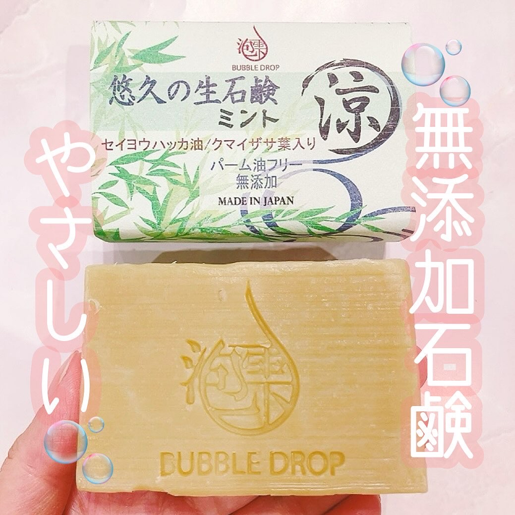 BUBBLEDROPパームオイル不使用[無添加コールドプロセス製法]悠久の生石鹸ミント涼コエタス様のモニターキャンペーンでいただきました。すっきりした洗い心地で、爽やかなミントが夏に合います。洗い上がりの肌にうるおいを感じられました。なめらか...