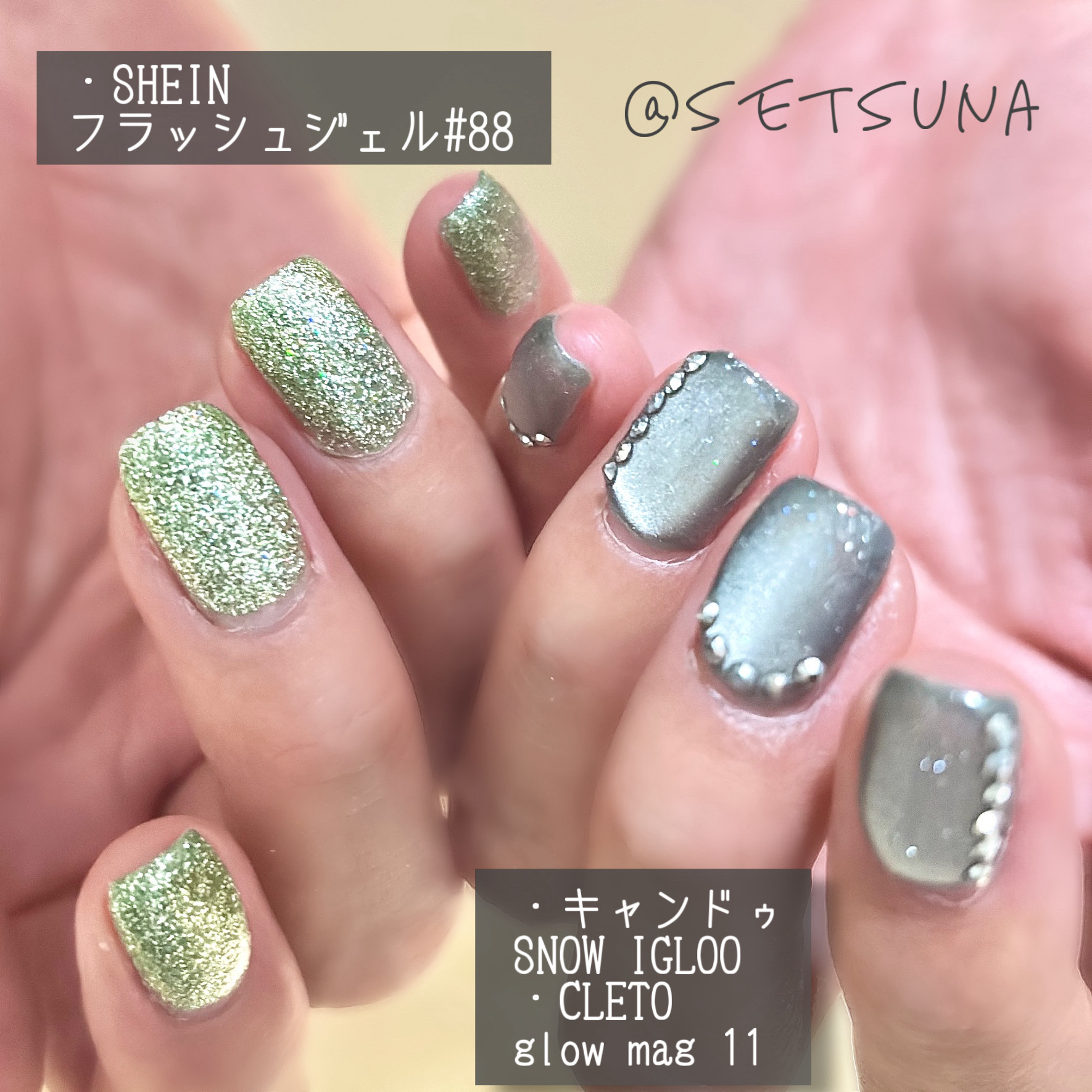 フラッシュオーロラネイル SHEINで購入したフラッシュジェルとオーロラパウダーのミント系の色でめっちゃ可愛いネイルになりました。 簡単でおすすめです。フラッシュジェルじゃなくても普通の好きなカラーにオーロラパウダー塗るだけでも可愛いー!♡ ベースジェルはグレースジェルさんのが多くてコスパ良きでおすすめ!✨