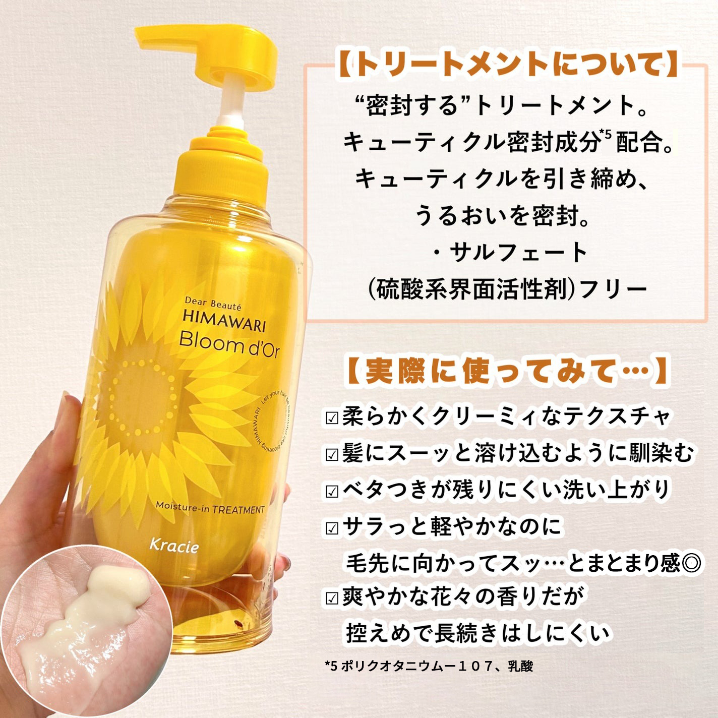 - <シャンプー ポンプ 390ml> 水、ラウラミドプロピルベタイン、ラウロイルメチルアラニンNa、イソペンチルジオール、ココイルグルタミン酸TEA、ヤシ油脂肪酸PEG-7グリセリル、ジラウラミドグルタミドリシンNa、ヒマワリ種子油脂肪酸フィトステリル、グリセリン、ヒマワリ種子油、ヒマワリ種子エキス、ヒマワリ花エキス、ポリクオタニウム-7、ポリクオタニウム-22、クエン酸、ラウリン酸PEG-2、ポリクオタニウム-10、セテアレス-60ミリスチルグリコール、グアーヒドロキシプロピルトリモニウムクロリド、ピロ亜硫酸Na、塩化Na、BG、EDTA-2Na、安息香酸Na、香料 <トリートメント ポンプ 390g> 水、セテアリルアルコール、ジメチコン、グリセリン、ジラウラミドグルタミドリシンNa、ヒマワリ種子油脂肪酸フィトステリル、ポリクオタニウム-107、ヒマワリ種子油、ヒマワリ種子エキス、ヒマワリ花エキス、PPG-2アルギニン、ミツロウ、乳酸、パラフィン、ビスジグリセリルポリアシルアジペート-2、ベヘナミドプロピルジメチルアミン、DPG、グリコシルトレハロース、水添ポリイソブテン、加水分解水添デンプン、イソプロパノール、(PEG-40/PPG-8メチルアミノプロピル/ヒドロキシプロピルジメチコン)コポリマー、ネオペンタン酸イソデシル、ラウレス-4、ラウレス-23、ステアリン酸PEG-55、クエン酸、BG、ステアルトリモニウムクロリド、安息香酸Na、メチルパラベン、香料、カラメル <シャンプー 詰替用 330ml> 水、ラウラミドプロピルベタイン、ラウロイルメチルアラニンNa、イソペンチルジオール、ココイルグルタミン酸TEA、ヤシ油脂肪酸PEG-7グリセリル、ジラウラミドグルタミドリシンNa、ヒマワリ種子油脂肪酸フィトステリル、グリセリン、ヒマワリ種子油、ヒマワリ種子エキス、ヒマワリ花エキス、ポリクオタニウム-7、ポリクオタニウム-22、クエン酸、ラウリン酸PEG-2、ポリクオタニウム-10、セテアレス-60ミリスチルグリコール、グアーヒドロキシプロピルトリモニウムクロリド、ピロ亜硫酸Na、塩化Na、BG、EDTA-2Na、安息香酸Na、香料 <トリートメント 詰替用 330g> 水、セテアリルアルコール、ジメチコン、グリセリン、ジラウラミドグルタミドリシンNa、ヒマワリ種子油脂肪酸フィトステリル、ポリクオタニウム-107、ヒマワリ種子油、ヒマワリ種子エキス、ヒマワリ花エキス、PPG-2アルギニン、ミツロウ、乳酸、パラフィン、ビスジグリセリルポリアシルアジペート-2、ベヘナミドプロピルジメチルアミン、DPG、グリコシルトレハロース、水添ポリイソブテン、加水分解水添デンプン、イソプロパノール、(PEG-40/PPG-8メチルアミノプロピル/ヒドロキシプロピルジメチコン)コポリマー、ネオペンタン酸イソデシル、ラウレス-4、ラウレス-23、ステアリン酸PEG-55、クエン酸、BG、ステアルトリモニウムクロリド、安息香酸Na、メチルパラベン、香料、カラメル