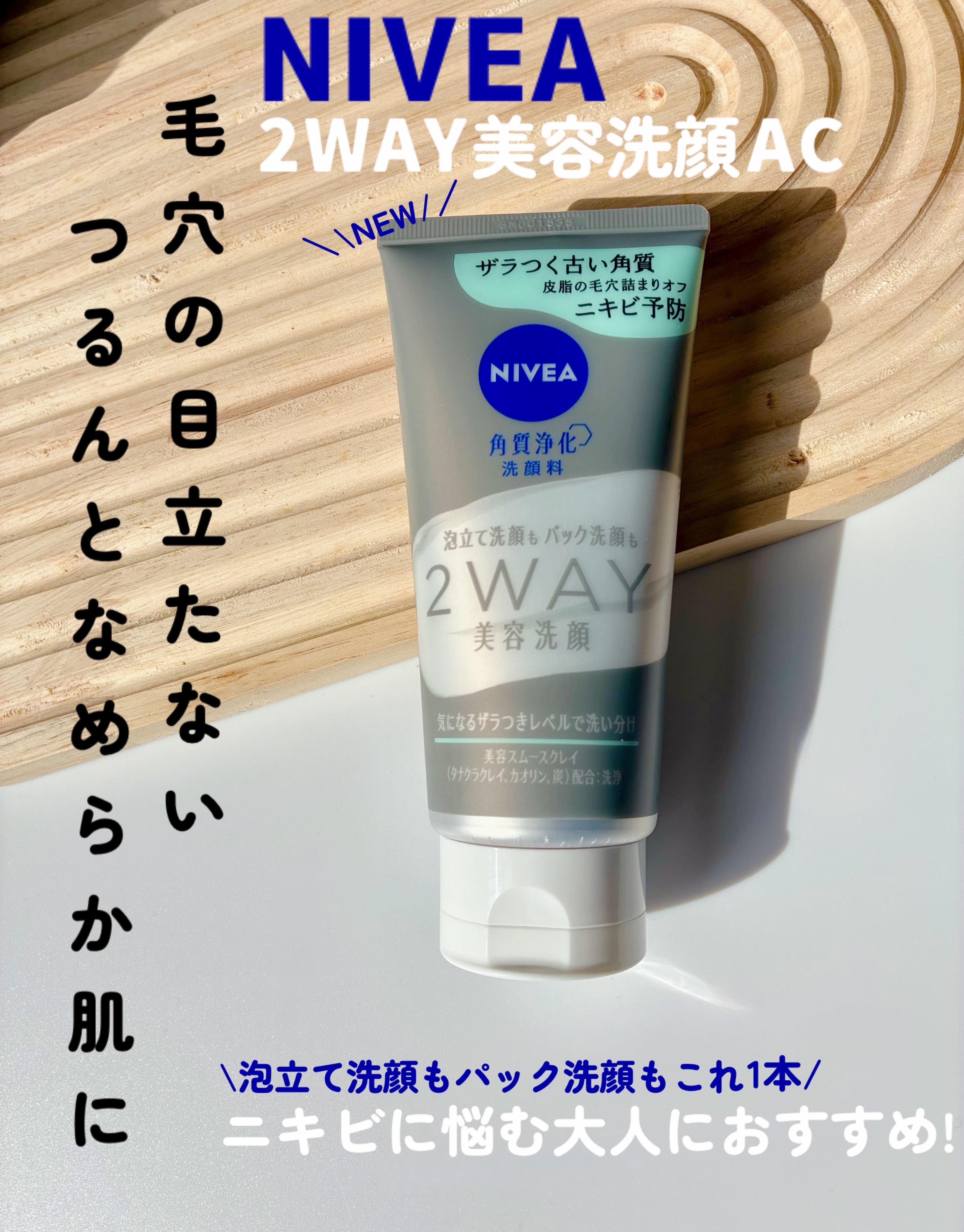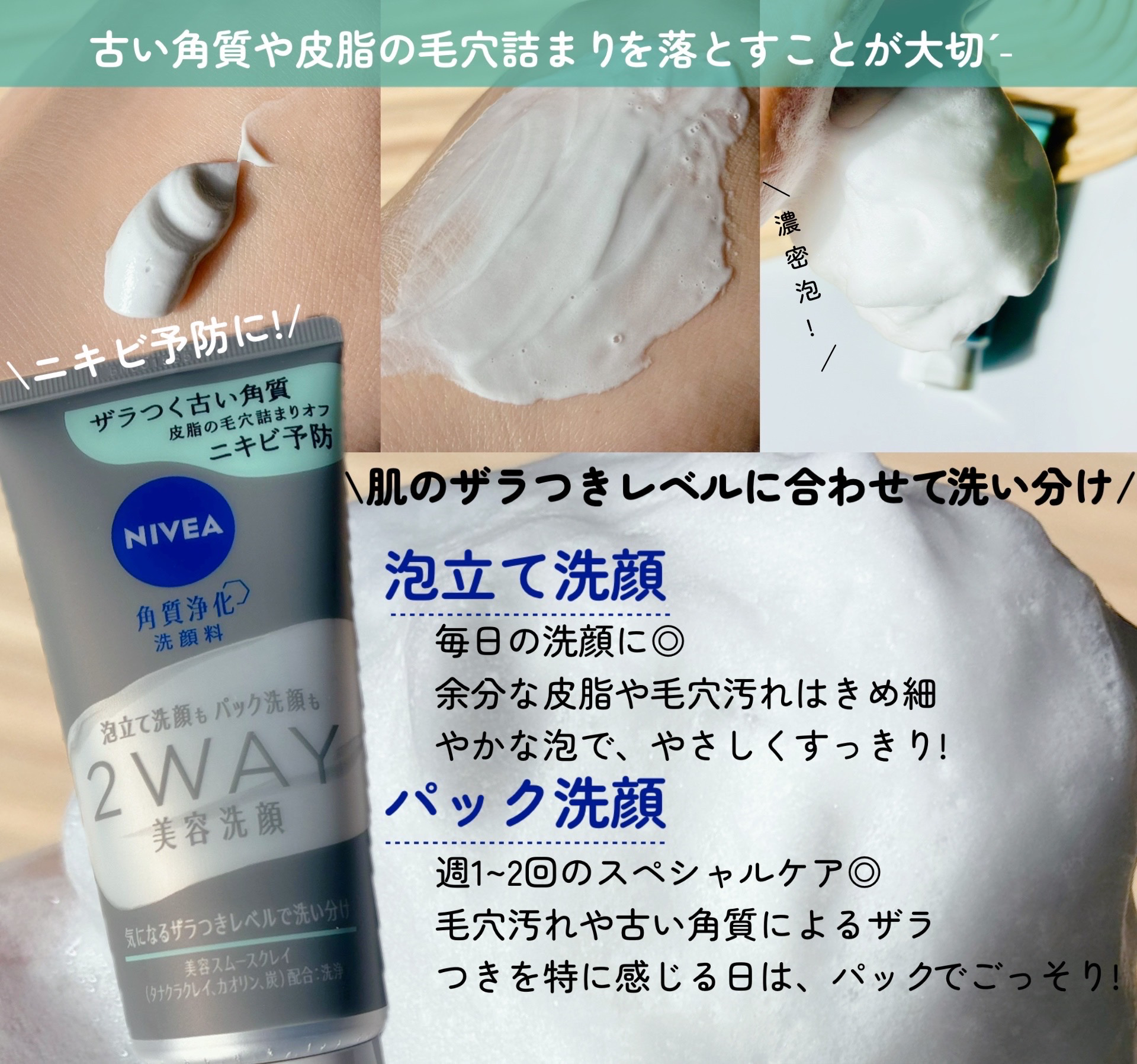 「ニベア花王」さまから商品提供をいただきました。NIVEA(ニベア)2WAY美容洗顔AC120gザラつく古い角質・皮脂の毛穴詰まりをオフしてニキビ予防ができる洗顔料です♡✔角質浄化アプローチ肌を潤いで柔らかくほぐして古い角質などの汚れを落とす...