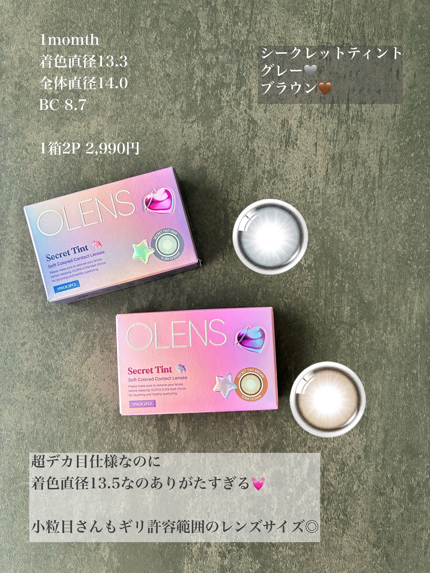 \OLENS新作カラコン/ダブルハイライターと細フチが印象的な目元に仕上げます🥹どっちも明るく発色するけど派手すぎず、目元に馴染んでかわいい💞▫️シークレットティントグレー/ブラウン1Month(1箱2枚入り)DIA:14.5mm着色直径:1...