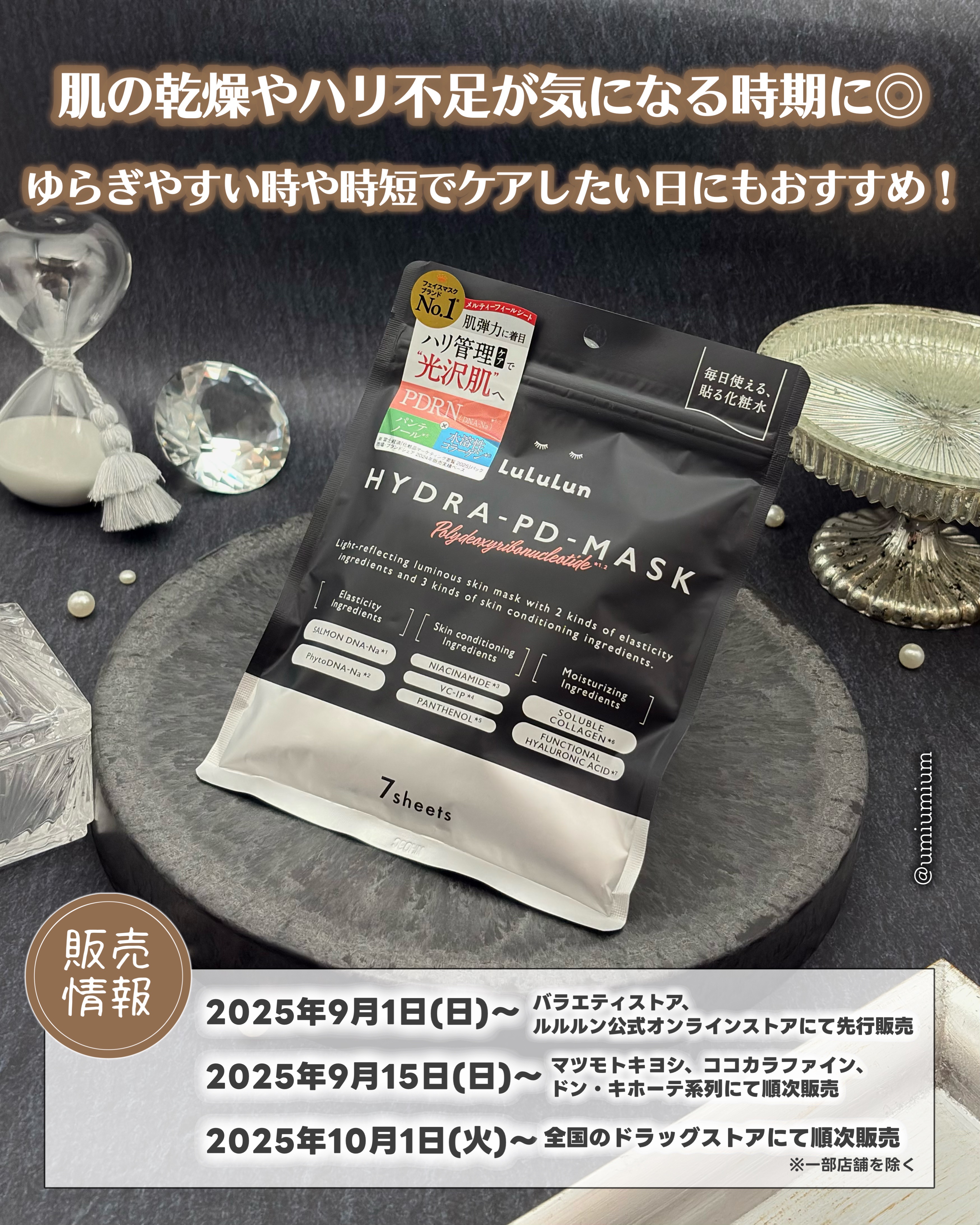 - 2025年9月1日から先行発売。 分子サイズの異なる、2種類のPDRN*1*2を配合。 内側から弾けるようなハリと弾⼒をサポートし、ふっくらうるおい、光をまとうような “光沢肌” へ導くフェイスマスクです。 低分⼦の植物由来、⾼分⼦のサーモン由来のPDRN*1*2をそれぞれ配合することで、分⼦の⼩さい⽅から順に肌へ浸透※し、段階的なアプローチを叶えます。 (*1 ハリ成分 DNA-Na、オタネニンジン根エキス *2 ハリ成分 DNA-Na ※ ⾓質層まで)
