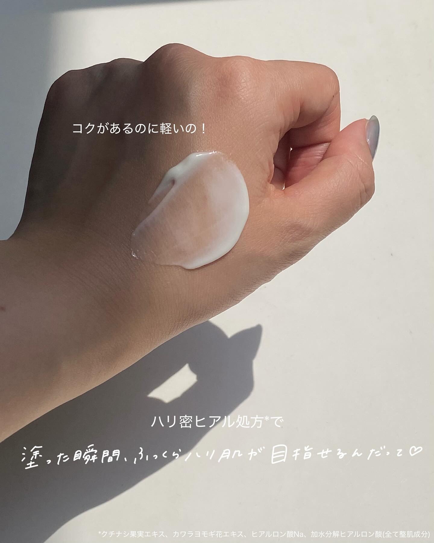 - 弾むようなハリとうるおいを与えるヒアルロン酸※クリーム ※ 加水分解ヒアルロン酸、ヒアルロン酸Na:整肌成分