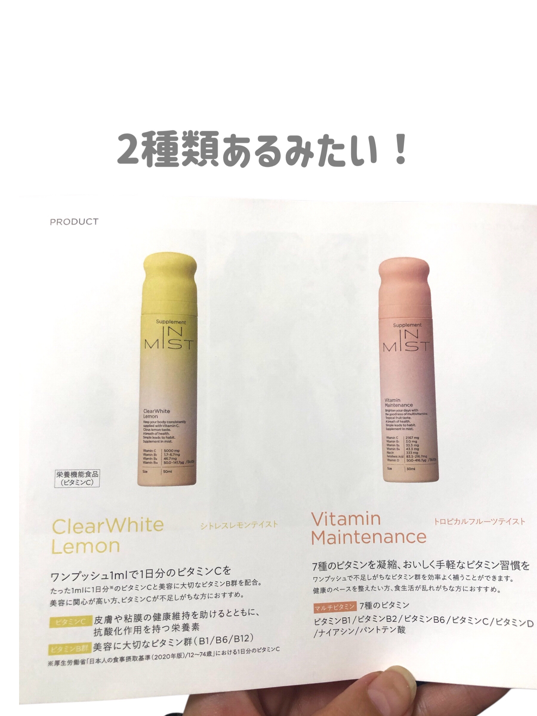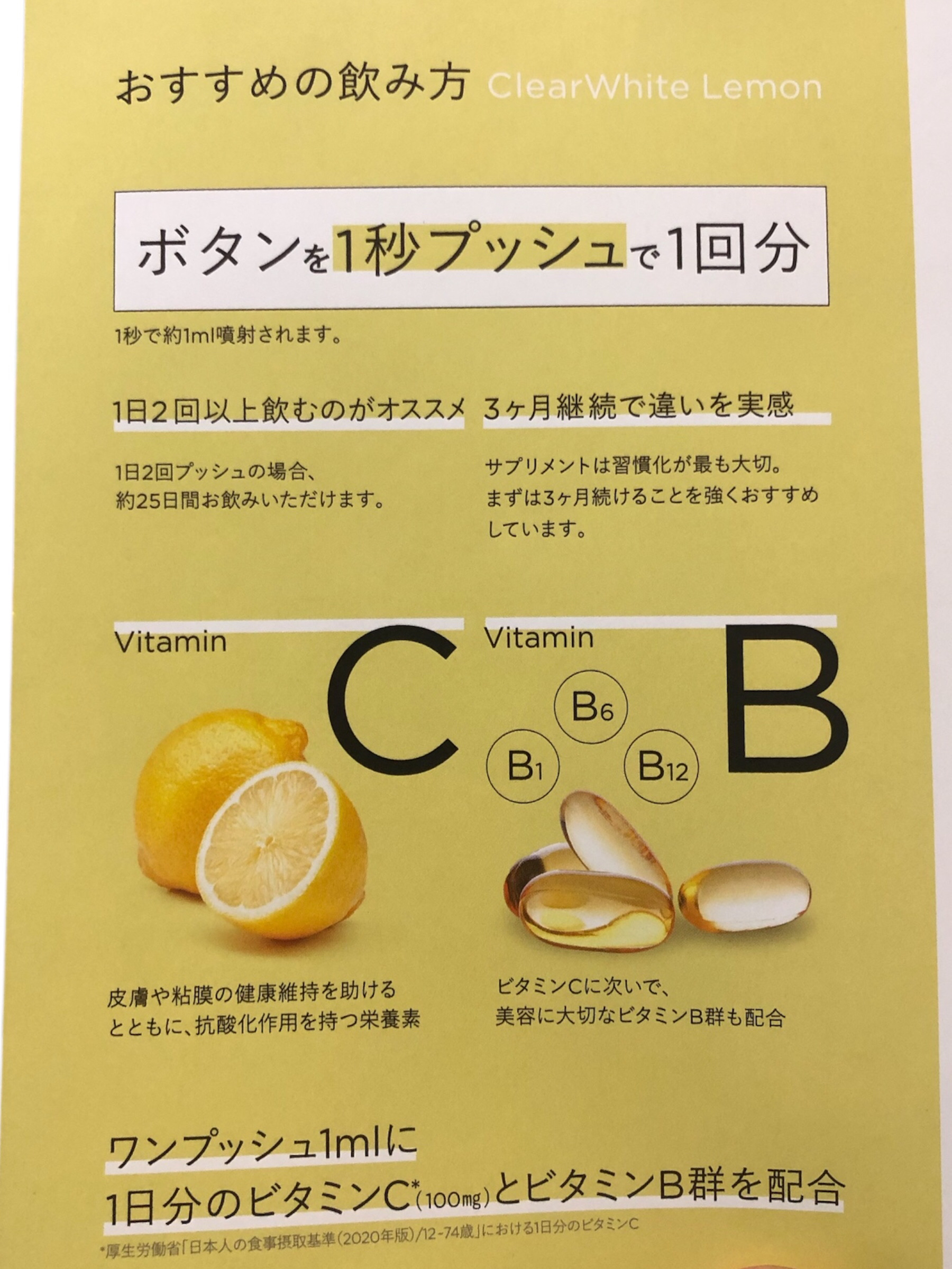 - ワンプッシュの美容ルーティン こまめなビタミン補給が、キレイの秘訣。 IN MISTは、ミストという独自の形でこの課題に対処しました。 水も不要、外出先でも美味しくワンプッシュ。液体ミストですぐに補給。独自開発の2重構造ボトルで常に高品質のまま届けます。 ◆ClearWhite Lemon とは ワンプッシュ1mlで1日分のビタミンC*が美味しく補給できるミストタイプのサプリメント(シトラスレモンテイスト) ClearWhite Lemonは、劣化しやすいビタミンCを「ピュアビタミンC」として配合。ダイレクトにアプローチし、美容と健康をサポートします。さらに、健康維持に欠かせないビタミンB群(B1、B6、B12)も含まれています。 <栄養機能食品> ビタミンCは、皮膚や粘膜の健康維持を助けるとともに、抗酸化作用を持つ栄養素です。 *「栄養素等表示基準値」における1日分のビタミンC ◆使い方 STEP.01 容器のフタを開ける STEP.02 ノズルを口に向けてワンプッシュ 1本で約25日間を目安にお使いいただけます。(目安量1日2回プッシュの場合) ※使用回数や噴射時間によって個人差があります ◆ClearWhite Lemon の特徴 1.こまめなビタミン補給が、キレイの秘訣。 ビタミンは数時間で体外に排出されるため、本当に大切なのは“こまめな補給”。 IN MISTなら水も不要で、どこでも美味しくワンプッシュ。持ち運びもしやすいから、外出先でも。しかも液体ミストだからスムーズに届きます。 2.独自開発の2重構造ボトルで高品質なビタミンを ビタミンは光や空気に弱いデリケートな成分。そんなビタミンを守るため、IN MISTは徹底的にこだわりました。 独自開発のアルミ2重構造ボトル“フレッシュキープボトル”で、ビタミンを徹底ガード。 最後のワンプッシュまで、高品質なビタミンをお届けします。 3.誰もが続けやすいサプリ体験 サプリメントで最も大切なのは「継続すること」。 ワンプッシュの手軽さと、独自の創味技術で仕上げた美味しさで、誰でも自然に続けられるサプリ習慣で内側から美しさを。