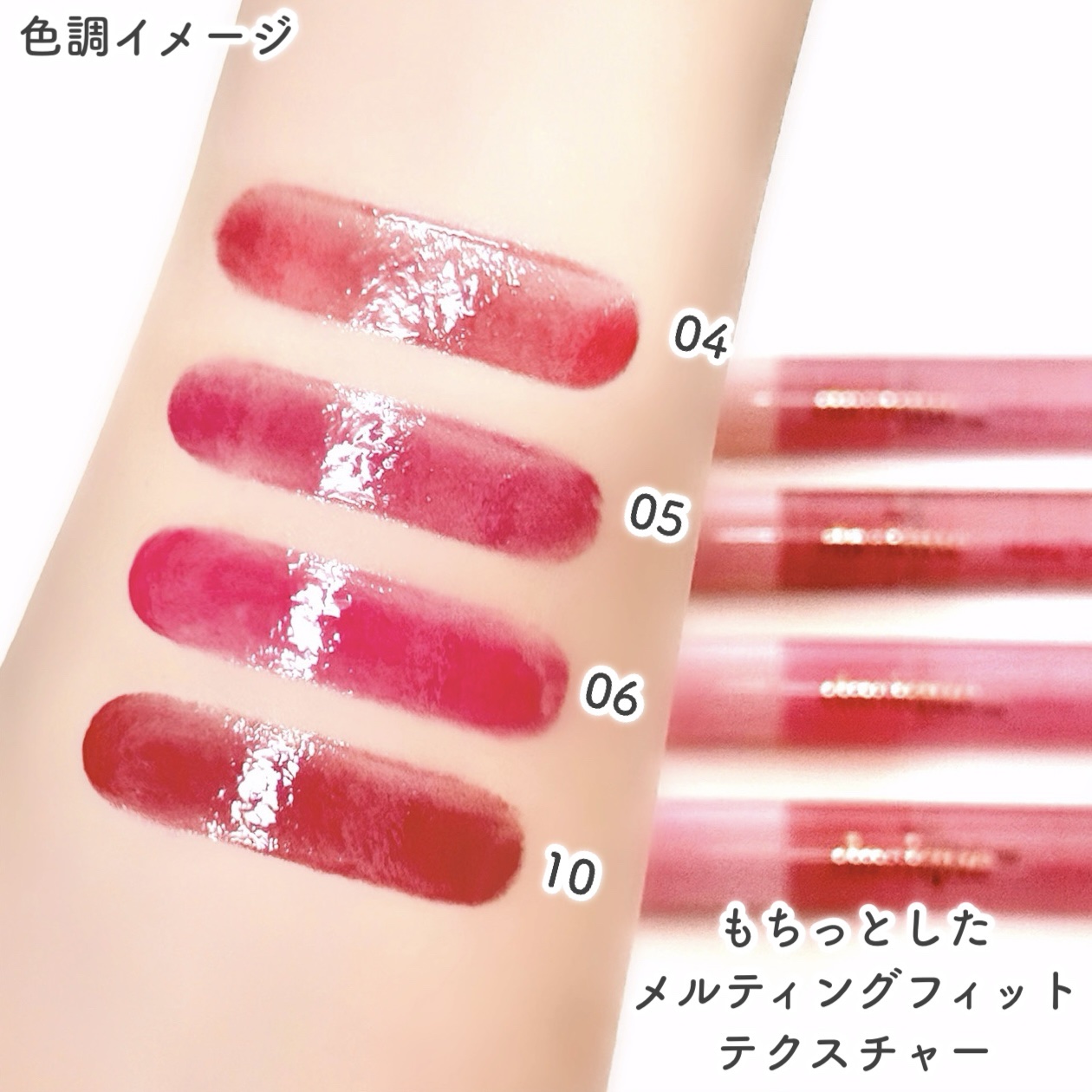 - <01 ジェントルピーチ> 水添ポリイソブテン、テトラ(ヒドロキシステアリン酸/イソステアリン酸)ジペンタエリスリチル、ヒドロキシステアリン酸エチルヘキシル、トリメリト酸トリトリデシル、水添ロジン酸メチル、ダイマージリノール酸(フィトステリル/イソステアリル/セチル/ステアリル/ベヘニル)、ジ安息香酸PG、合成ワックス、リンゴ酸ジイソステアリル、パラフィン、マカデミアナッツ脂肪酸フィトステリル、シリル化シリカ、イソステアリン酸ソルビタン、(VP/ヘキサデセン)コポリマー、酸化チタン、パルミチン酸デキストリン、マイクロクリスタリンワックス、トリイソステアリン酸ポリグリセリル-2、酸化鉄、赤202、黄5、ジイソステアリン酸ポリグリセリル-2、水、アルガニアスピノサ核油、ホホバ種子油、BG、サトウカエデエキス、フェノキシエタノール、アサイヤシ果実エキス、フラガリアチロエンシス果実エキス、クコ果実エキス、クロミグワ果実エキス、クロフサスグリ果実エキス、セイヨウヤブイチゴ果実エキス、キイチゴエキス、ローブッシュブルーベリー果実エキス、クランベリー果実エキス、ビルベリー果実エキス、エチルヘキシルグリセリン <02 アップルシナモン> 水添ポリイソブテン、テトラ(ヒドロキシステアリン酸/イソステアリン酸)ジペンタエリスリチル、ヒドロキシステアリン酸エチルヘキシル、トリメリト酸トリトリデシル、水添ロジン酸メチル、ダイマージリノール酸(フィトステリル/イソステアリル/セチル/ステアリル/ベヘニル)、ジ安息香酸PG、合成ワックス、パラフィン、リンゴ酸ジイソステアリル、マカデミアナッツ脂肪酸フィトステリル、シリル化シリカ、イソステアリン酸ソルビタン、(VP/ヘキサデセン)コポリマー、トリイソステアリン酸ポリグリセリル-2、パルミチン酸デキストリン、酸化鉄、マイクロクリスタリンワックス、酸化チタン、赤202、ジイソステアリン酸ポリグリセリル-2、黄5、水、アルガニアスピノサ核油、ホホバ種子油、BG、サトウカエデエキス、フェノキシエタノール、アサイヤシ果実エキス、フラガリアチロエンシス果実エキス、クコ果実エキス、クロミグワ果実エキス、クロフサスグリ果実エキス、セイヨウヤブイチゴ果実エキス、キイチゴエキス、ローブッシュブルーベリー果実エキス、クランベリー果実エキス、ビルベリー果実エキス、エチルヘキシルグリセリン <03 ローズミルクティー> 水添ポリイソブテン、テトラ(ヒドロキシステアリン酸/イソステアリン酸)ジペンタエリスリチル、ヒドロキシステアリン酸エチルヘキシル、トリメリト酸トリトリデシル、水添ロジン酸メチル、ダイマージリノール酸(フィトステリル/イソステアリル/セチル/ステアリル/ベヘニル)、ジ安息香酸PG、合成ワックス、リンゴ酸ジイソステアリル、パラフィン、マカデミアナッツ脂肪酸フィトステリル、シリル化シリカ、イソステアリン酸ソルビタン、(VP/ヘキサデセン)コポリマー、酸化チタン、トリイソステアリン酸ポリグリセリル-2、パルミチン酸デキストリン、マイクロクリスタリンワックス、酸化鉄、黄4、赤202、ジイソステアリン酸ポリグリセリル-2、青1、水、アルガニアスピノサ核油、ホホバ種子油、BG、サトウカエデエキス、フェノキシエタノール、アサイヤシ果実エキス、フラガリアチロエンシス果実エキス、クコ果実エキス、クロミグワ果実エキス、クロフサスグリ果実エキス、セイヨウヤブイチゴ果実エキス、キイチゴエキス、ローブッシュブルーベリー果実エキス、クランベリー果実エキス、ビルベリー果実エキス、エチルヘキシルグリセリン <04 ヌーディーフィグ> 水添ポリイソブテン、テトラ(ヒドロキシステアリン酸/イソステアリン酸)ジペンタエリスリチル、ヒドロキシステアリン酸エチルヘキシル、トリメリト酸トリトリデシル、水添ロジン酸メチル、ダイマージリノール酸(フィトステリル/イソステアリル/セチル/ステアリル/ベヘニル)、ジ安息香酸PG、合成ワックス、リンゴ酸ジイソステアリル、パラフィン、マカデミアナッツ脂肪酸フィトステリル、シリル化シリカ、イソステアリン酸ソルビタン、(VP/ヘキサデセン)コポリマー、酸化チタン、パルミチン酸デキストリン、マイクロクリスタリンワックス、トリイソステアリン酸ポリグリセリル-2、酸化鉄、黄4、赤202、ジイソステアリン酸ポリグリセリル-2、水、アルガニアスピノサ核油、ホホバ種子油、BG、サトウカエデエキス、フェノキシエタノール、アサイヤシ果実エキス、フラガリアチロエンシス果実エキス、クコ果実エキス、クロミグワ果実エキス、クロフサスグリ果実エキス、セイヨウヤブイチゴ果実エキス、キイチゴエキス、ローブッシュブルーベリー果実エキス、クランベリー果実エキス、ビルベリー果実エキス、エチルヘキシルグリセリン <05 シュガープラム> 水添ポリイソブテン、テトラ(ヒドロキシステアリン酸/イソステアリン酸)ジペンタエリスリチル、ヒドロキシステアリン酸