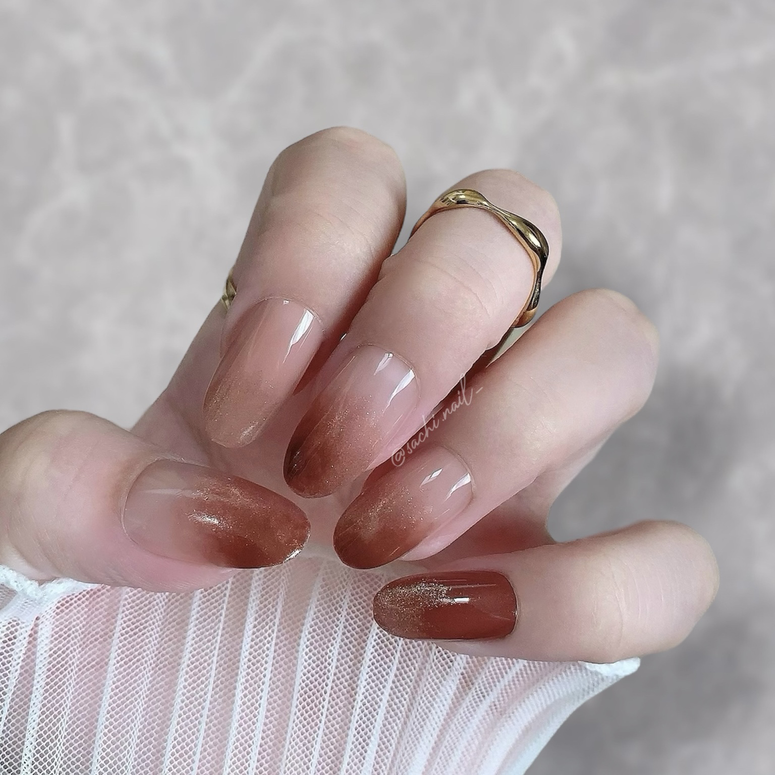ワンカラーでも指ごとに色を変えるだけでオシャレに見えます💕 画像のようにゴールドラインとストーンを少し足すだけで華やかさがアップ🥰 何度かご紹介したことのあるスポンジで作るグラデーションです✨ スポンジを使うことで境目が綺麗に馴染んでくれます💕 アルミホイルの上でブラウンとトップコートを1:1くらいで混ぜたものを、トップコートのハケに取って3箇所に塗るだけ👌 事前に混ぜたものを塗ることで、爪の上でぼかすより簡単に出来ます💕 ベースカラーが乾く前に点置きしてぼかすことで綺麗にぼかせます✨ スピードが大事なので、使うポリッシュのキャップは全て開けておきましょう😊 天然石のラインはガタガタの方がより天然石っぽく見えるので、ラインを描くのが苦手な方でも大丈夫🙆♀️ 難しそうに見えて、やってみると意外と簡単に出来ます♡