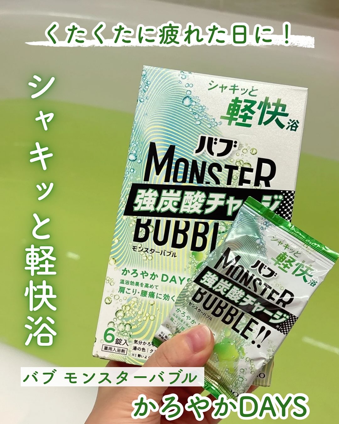 花王さまからいただきました。バブモンスターバブルかろやかDAYS強炭酸チャージ*で疲れた日にジュワッと気持ちいい!透き通るようなグリーンのお湯は色味も癒される〜🌱シャキッと軽快浴したいならバブ!*勢いよく発泡しながら、炭酸がお湯に溶け込むこと...