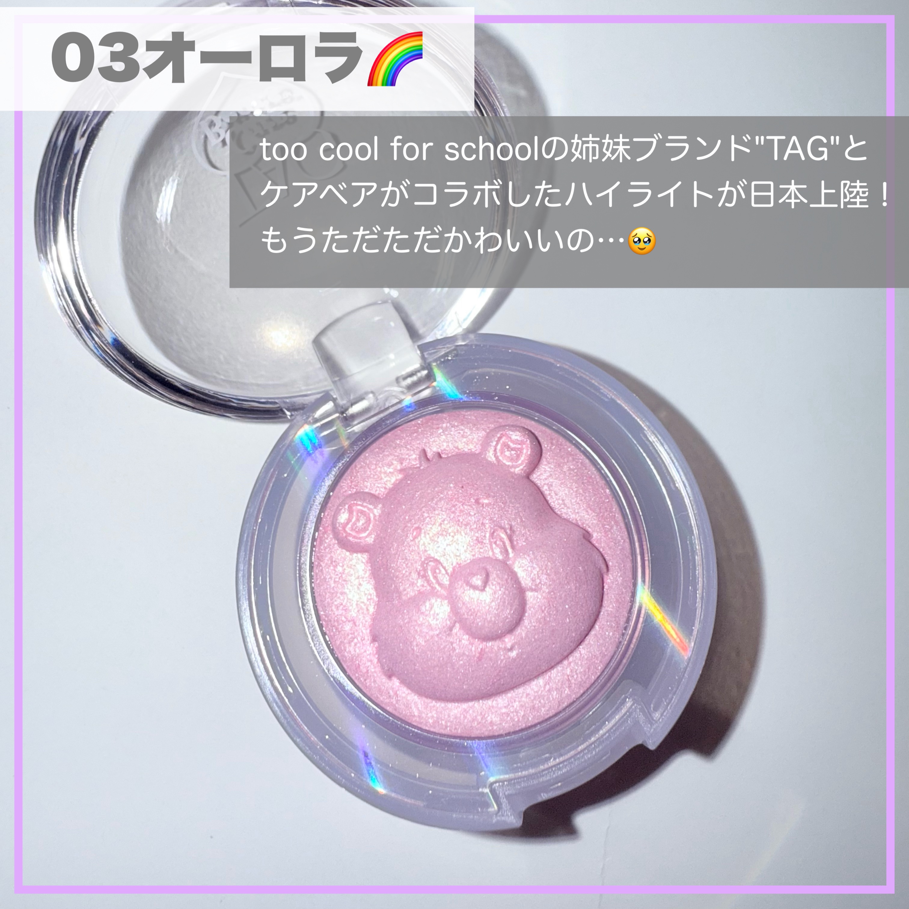 TAGStarlitBeamLighter#提供ケアベアコラボの新作可愛くない?ガチャガチャのカプセルみたいなケースにケアベアの形のハイライターサラッとツヤッと輝くパールが綺麗😍スターリットビームライター03オーロラ多彩な光が重なり反射するよ...