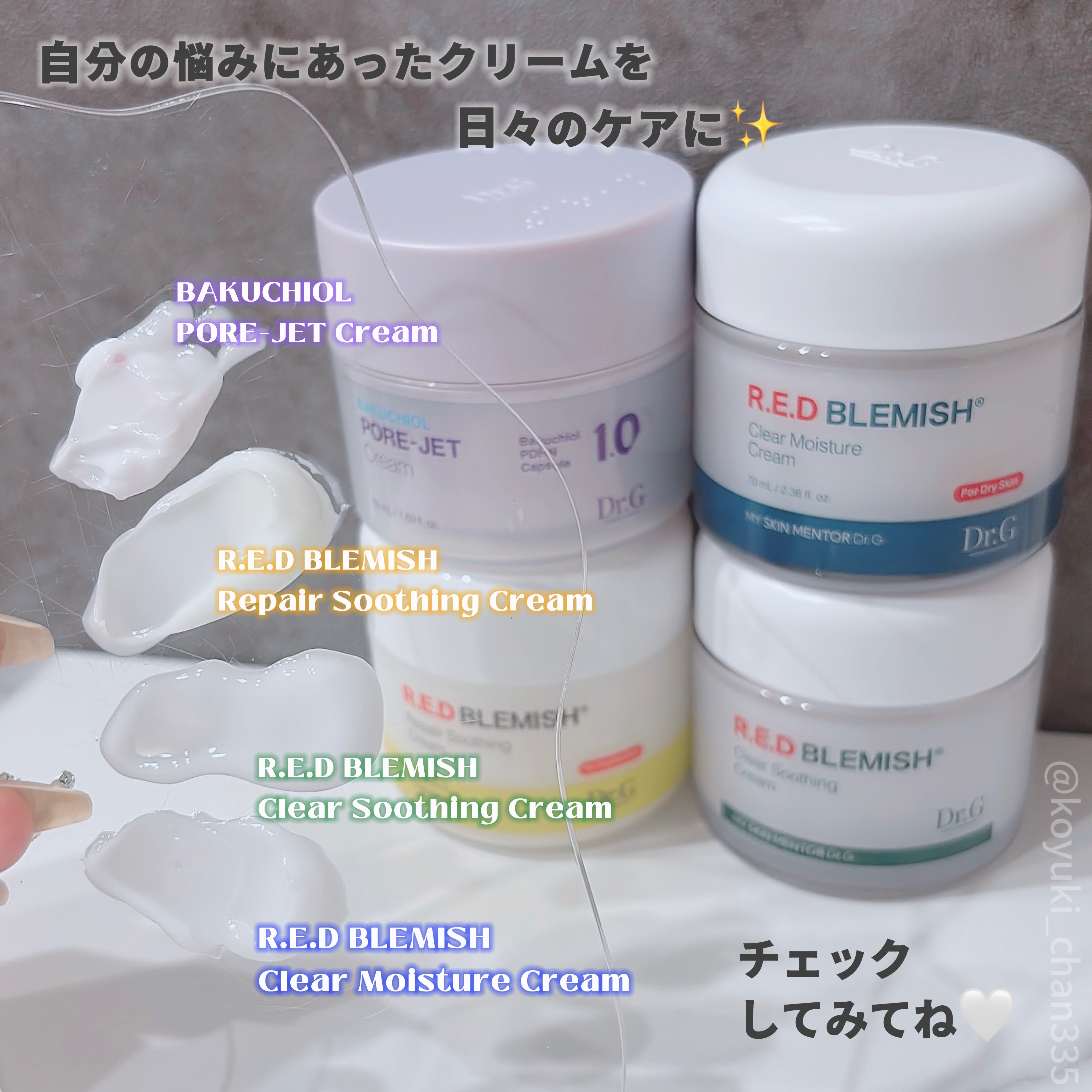 お悩みで選べるクリーム全種類レポ🗒️☆韓国ドクターズコスメといえばDr.G🥼♥Dr.G#レッドブレミッシュクリアスージングクリーム💚→冷感ケア、ニキビケア#レッドブレミッシュクリアモイスチャークリーム💙→乾燥からくる敏感肌、保湿#レッドブレミ...