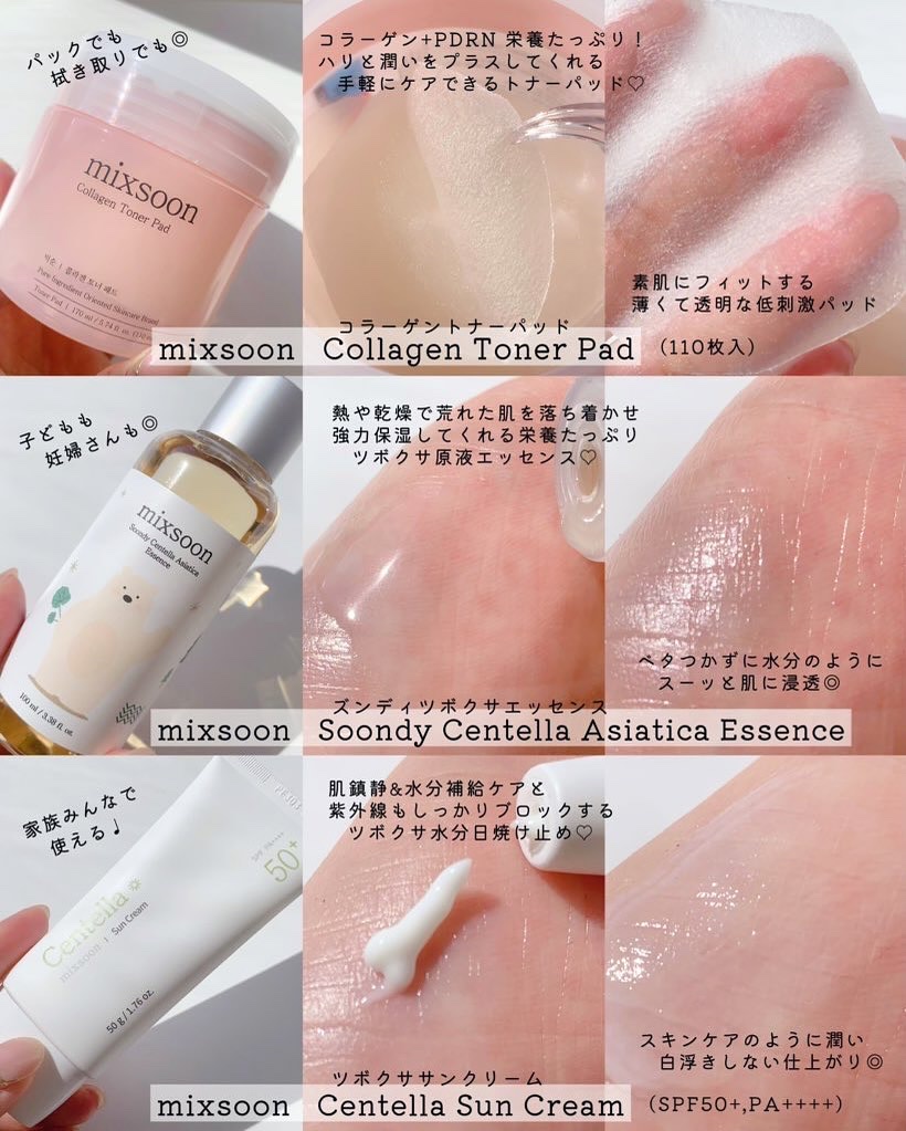 #PR#mixsoon@mixsoon_jpミクスン様から、人気商品4種ご提供頂きました😊大豆エッセンス💛ツボクサエッセンス💛コラーゲントナーパッド💛ツボクササンクリーム💛詳しい内容は画像にまとめたよ♪私は特にコラーゲンパッドとサンクリームが...