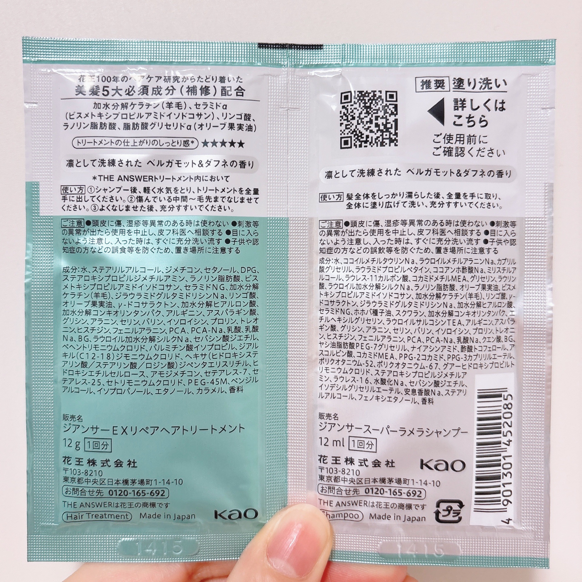 - 世界初*1! 花王100年のヘアケア研究からたどり着いた美髪5大必須成分 *2 (補修)配合 <お試し容量セット> シャンプー 320ml (通常品 400ml) トリートメント 180g (通常品 220g) <ピロー> シャンプー 12ml ヘアトリートメント 12g SUPER LAMELLAR SHAMPOO シャンプー内に構築したラメラ層に、ケア成分を蓄える“ラメラプラットフォーム技術”採用 ノンシリコーン処方 パラベンフリー サルフェートフリー 合成着色料フリー + EX REPAIR TREATMENT 繰り返し行うカラーダメージに 補修成分 セラミドα(ビスメトキシプロピルアミドイソドコサン)/ラノリン脂肪酸 高濃度*3配合 糸を引くほど濃厚なテクスチャー *1 加水分解ケラチン(羊毛)、ビスメトキシプロピルアミドイソドコサン(花王独自成分)、リンゴ酸、ラノリン脂肪酸、オリーブ果実油の5成分の組み合わせ(Mintel社データベース内2024年3⽉当社調べ) *2 加水分解ケラチン(羊毛)、セラミドα(ビスメトキシプロピルアミドイソドコサン)、リンゴ酸、ラノリン脂肪酸、脂肪酸グリセリドα(オリーブ果実油) *3 THE ANSWERトリートメント内において