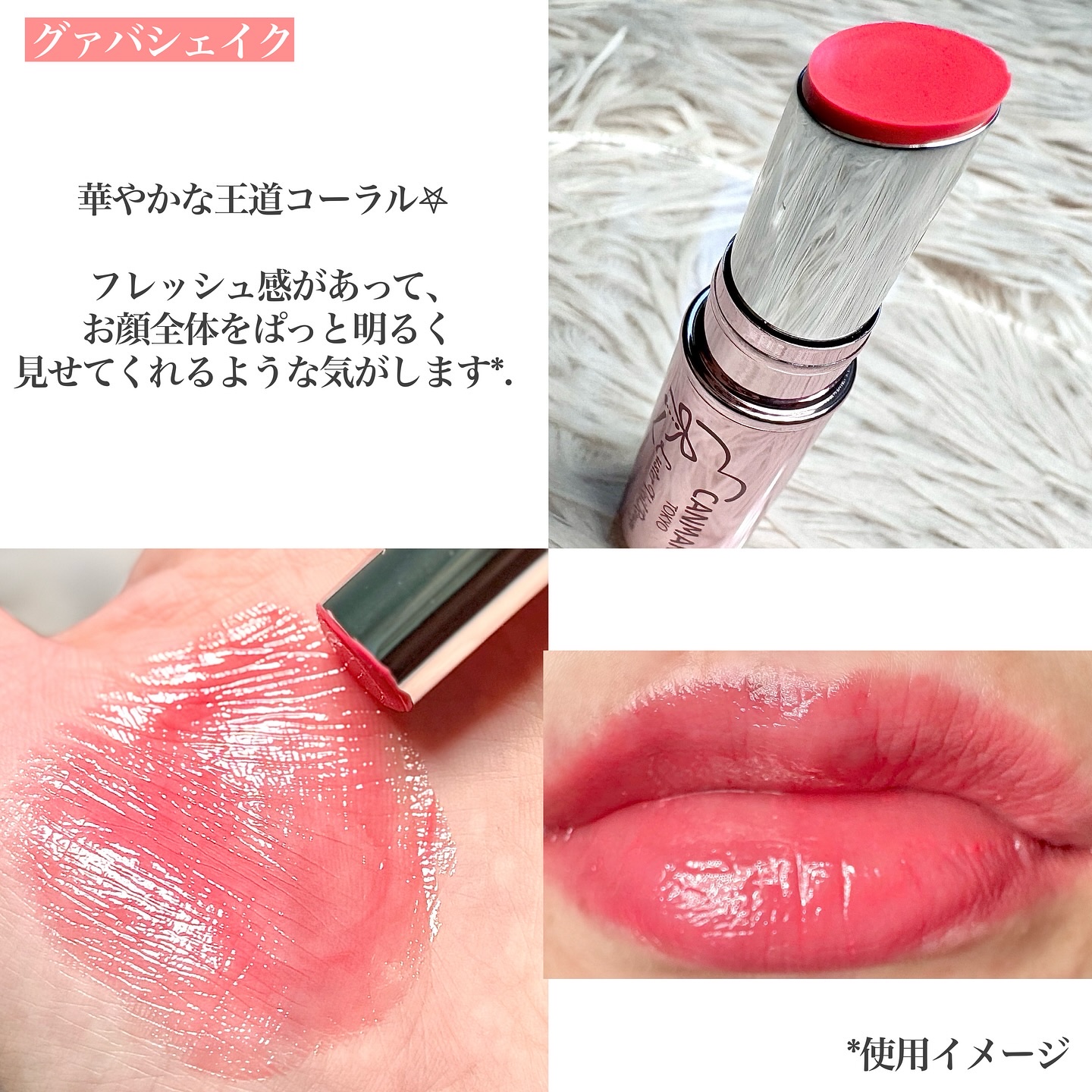 - <01 ライチペシェ> アルキル(C20ー24)ジメチコン、水添ポリイソブテン、ペンタイソステアリン酸ジペンタエリスリチル、オクチルドデカノール、トリ(カプリル酸/カプリン酸)グリセリル、ダイマージリノール酸(フィトステリル/イソステアリル/セチル/ステアリル/ベヘニル)、ラウロイルグルタミン酸ジ(フィトステリル/オクチルドデシル)、パラフィン、ラウロイルグルタミン酸ジ(オクチルドデシル/フィトステリル/ベヘニル)、合成ワックス、イソノナン酸イソトリデシル、水添ココグリセリル、リンゴ酸ジイソステアリル、酸化チタン、マカデミア種子油、ツボクサエキス、キトサン、トリ脂肪酸(C10ー18)グリセリル、合成フルオロフロゴパイト、トリイソステアリン酸ポリグリセリルー2、マイクロクリスタリンワックス、(エチレン/プロピレン)コポリマー、ジイソステアリン酸ポリグリセリルー2、ステアラルコニウムヘクトライト、炭酸プロピレン、トコフェロール、水、アラントイン、ナイアシンアミド、グリセリン、BG、水添レシチン、1,2ーヘキサンジオール、アブラナステロ―ルズ、レチノール、コレステロール、ラウリン酸ポリグリセリルー10、セラミドNP、ステアリン酸水酸化(Al/Mg)、テトラ(ジーt-ブチルヒドロキシヒドロケイヒ酸)ペンタエリスリチル、セチルリン酸K、クエン酸トリス(テトラメチルヒドロキシピペリジノール)、酸化鉄、赤104(1)、赤202、赤227、青1、黄4 <02 ロゼフランボワーズ> アルキル(C20ー24)ジメチコン、水添ポリイソブテン、ペンタイソステアリン酸ジペンタエリスリチル、オクチルドデカノール、トリ(カプリル酸/カプリン酸)グリセリル、ダイマージリノール酸(フィトステリル/イソステアリル/セチル/ステアリル/ベヘニル)、ラウロイルグルタミン酸ジ(フィトステリル/オクチルドデシル)、パラフィン、ラウロイルグルタミン酸ジ(オクチルドデシル/フィトステリル/ベヘニル)、合成ワックス、イソノナン酸イソトリデシル、水添ココグリセリル、リンゴ酸ジイソステアリル、酸化チタン、マカデミア種子油、ツボクサエキス、キトサン、トリ脂肪酸(C10ー18)グリセリル、合成フルオロフロゴパイト、トリイソステアリン酸ポリグリセリルー2、マイクロクリスタリンワックス、(エチレン/プロピレン)コポリマー、ジイソステアリン酸ポリグリセリルー2、ステアラルコニウムヘクトライト、炭酸プロピレン、トコフェロール、水、アラントイン、ナイアシンアミド、グリセリン、BG、水添レシチン、1,2ーヘキサンジオール、アブラナステロ―ルズ、レチノール、コレステロール、ラウリン酸ポリグリセリルー10、セラミドNP、ステアリン酸水酸化(Al/Mg)、テトラ(ジーt-ブチルヒドロキシヒドロケイヒ酸)ペンタエリスリチル、セチルリン酸K、クエン酸トリス(テトラメチルヒドロキシピペリジノール)、酸化鉄、赤202、青1、黄5 <03 グァバシェイク> アルキル(C20ー24)ジメチコン、水添ポリイソブテン、ペンタイソステアリン酸ジペンタエリスリチル、オクチルドデカノール、トリ(カプリル酸/カプリン酸)グリセリル、ダイマージリノール酸(フィトステリル/イソステアリル/セチル/ステアリル/ベヘニル)、ラウロイルグルタミン酸ジ(フィトステリル/オクチルドデシル)、パラフィン、ラウロイルグルタミン酸ジ(オクチルドデシル/フィトステリル/ベヘニル)、合成ワックス、イソノナン酸イソトリデシル、水添ココグリセリル、リンゴ酸ジイソステアリル、トリイソステアリン酸ポリグリセリルー2、酸化チタン、マカデミア種子油、ツボクサエキス、キトサン、トリ脂肪酸(C10ー18)グリセリル、合成フルオロフロゴパイト、マイクロクリスタリンワックス、(エチレン/プロピレン)コポリマー、ジイソステアリン酸ポリグリセリルー2、ステアラルコニウムヘクトライト、炭酸プロピレン、トコフェロール、水、アラントイン、ナイアシンアミド、グリセリン、BG、水添レシチン、1,2ーヘキサンジオール、アブラナステロ―ルズ、レチノール、コレステロール、ラウリン酸ポリグリセリルー10、セラミドNP、ステアリン酸水酸化(Al/Mg)、テトラ(ジーt-ブチルヒドロキシヒドロケイヒ酸)ペンタエリスリチル、セチルリン酸K、クエン酸トリス(テトラメチルヒドロキシピペリジノール)、酸化鉄、赤104(1)、赤201、赤202、黄4、黄5