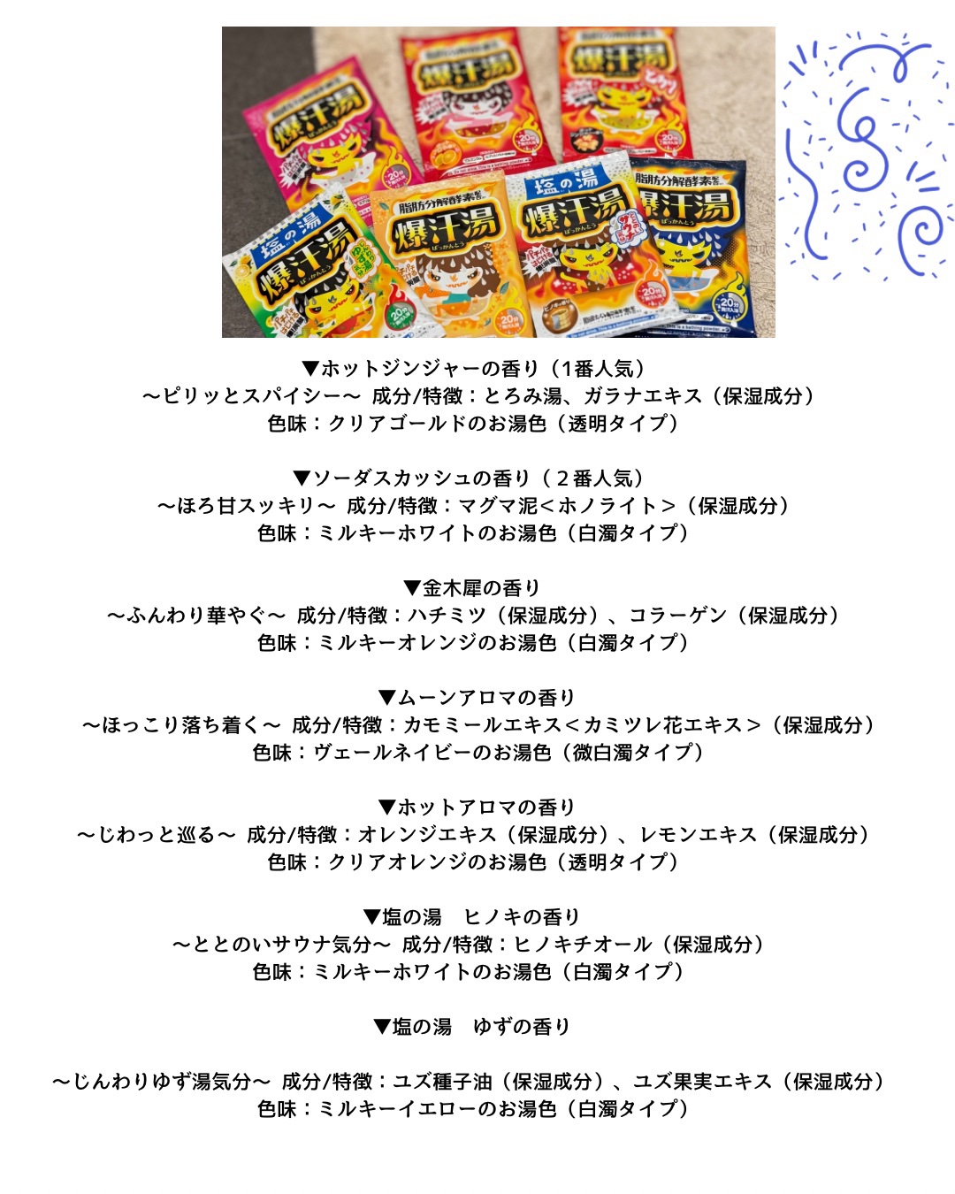 \お風呂時間が一気にイベント化🛁✨/ ✔️爆汗湯全7種 60g286円(税込)ソーダスカッシュの香りホットジンジャーの香り金木犀の香りムーンアロマの香りホットアロマの香り塩の湯ヒノキの香り塩の湯ゆずの香り💫全国のドン・キホーテ、ドラッグスト...