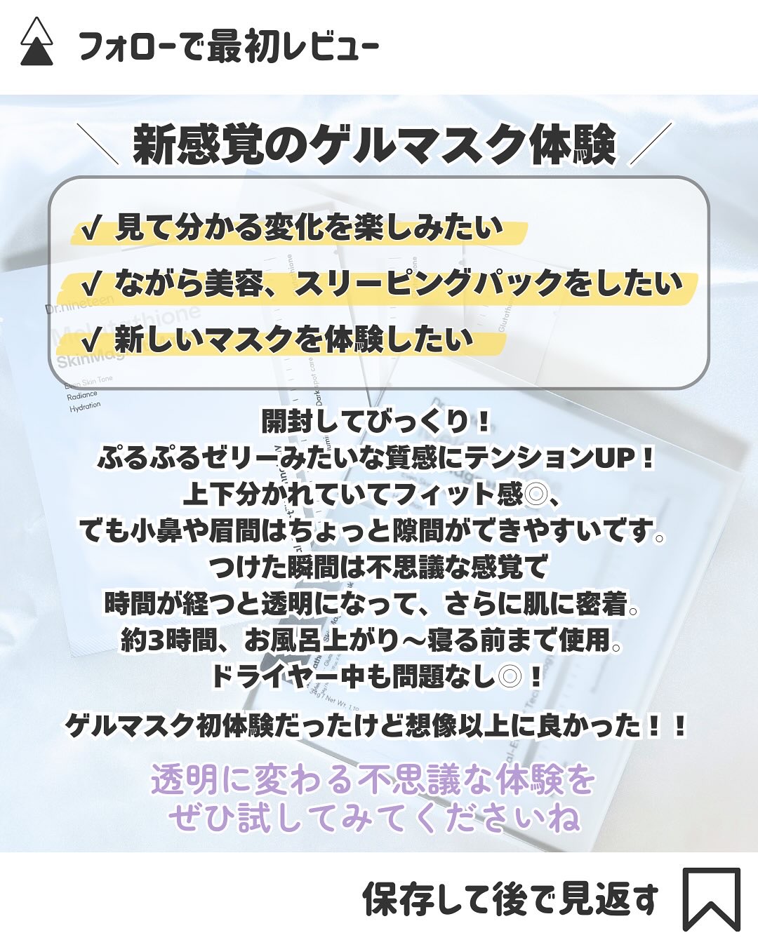 | スキンケアランキング第10位 | 水分をたっぷり含んだ透明なウォーターゲルシートがぷるぷる、美容液ひたひたですごい👀 ˎˊ˗ | 詳細を見る | ||