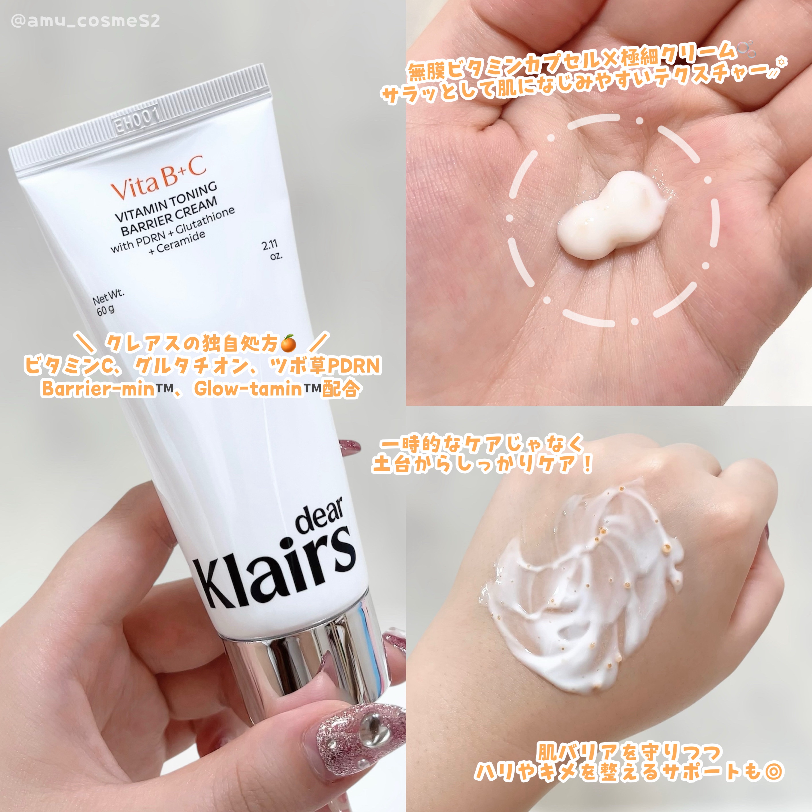 𝑵𝒆𝒘。.໒꒱°*𝒅𝒆𝒂𝒓,𝑲𝒍𝒂𝒊𝒓𝒔PDRNビタグルバリアクリーム敏感になりがちな時期にも嬉しいクレアス独自処方のクリーム秋冬の肌に使いやすい仕様です◎クリームをよく見るとオレンジ色の小さなツブツブが入っていてこれがクリームの特徴みたいし...